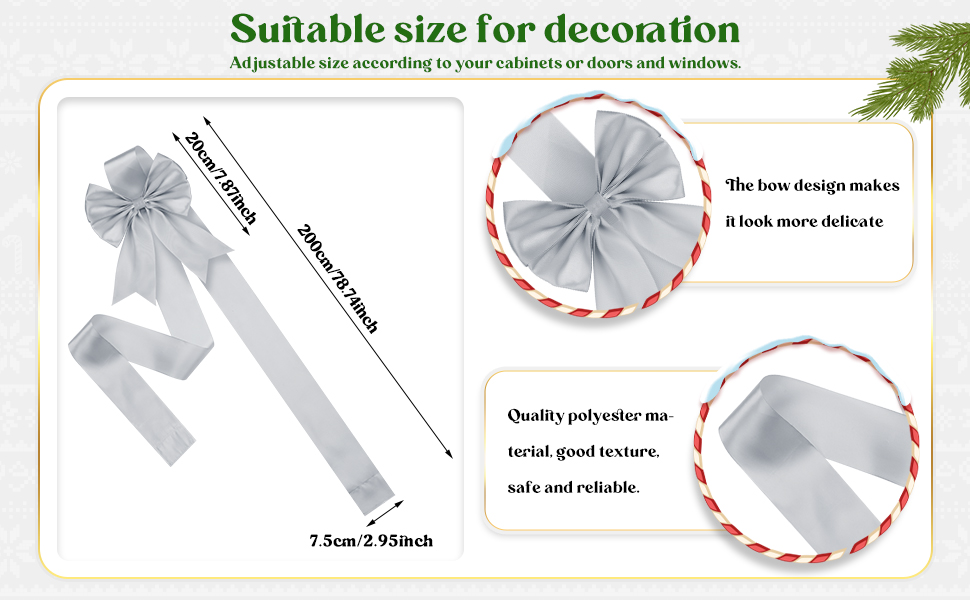 • مواد ذات جودة عالية: هذا القوس اللامع لعيد الميلاد مصنوع من مادة البوليستر، والتي تتميز بملمس ممتاز، وآمنة وموثوقة، مع عمر خدمة طويل؛ تصميم القوس يجعلها تبدو أكثر روعة ويضيف المزيد من السحر والأناقة إلى حفلتك أو الباب أو الخزانة