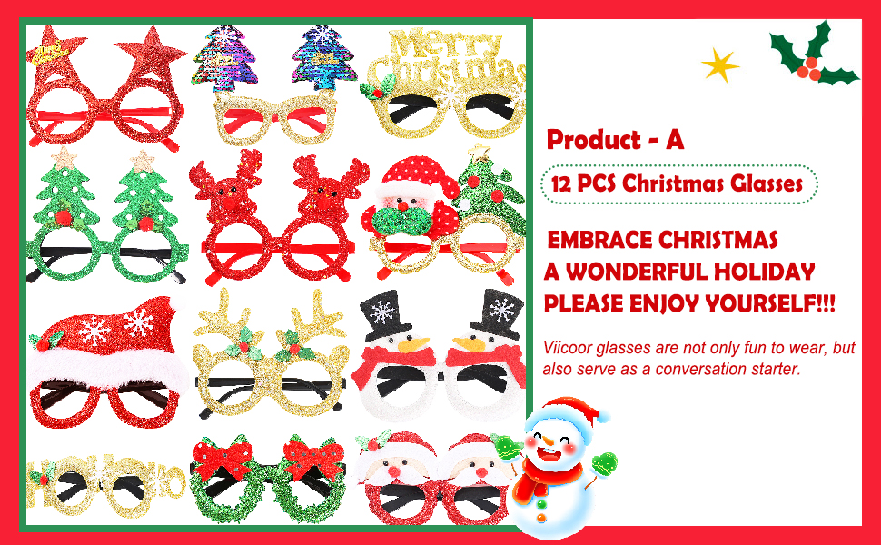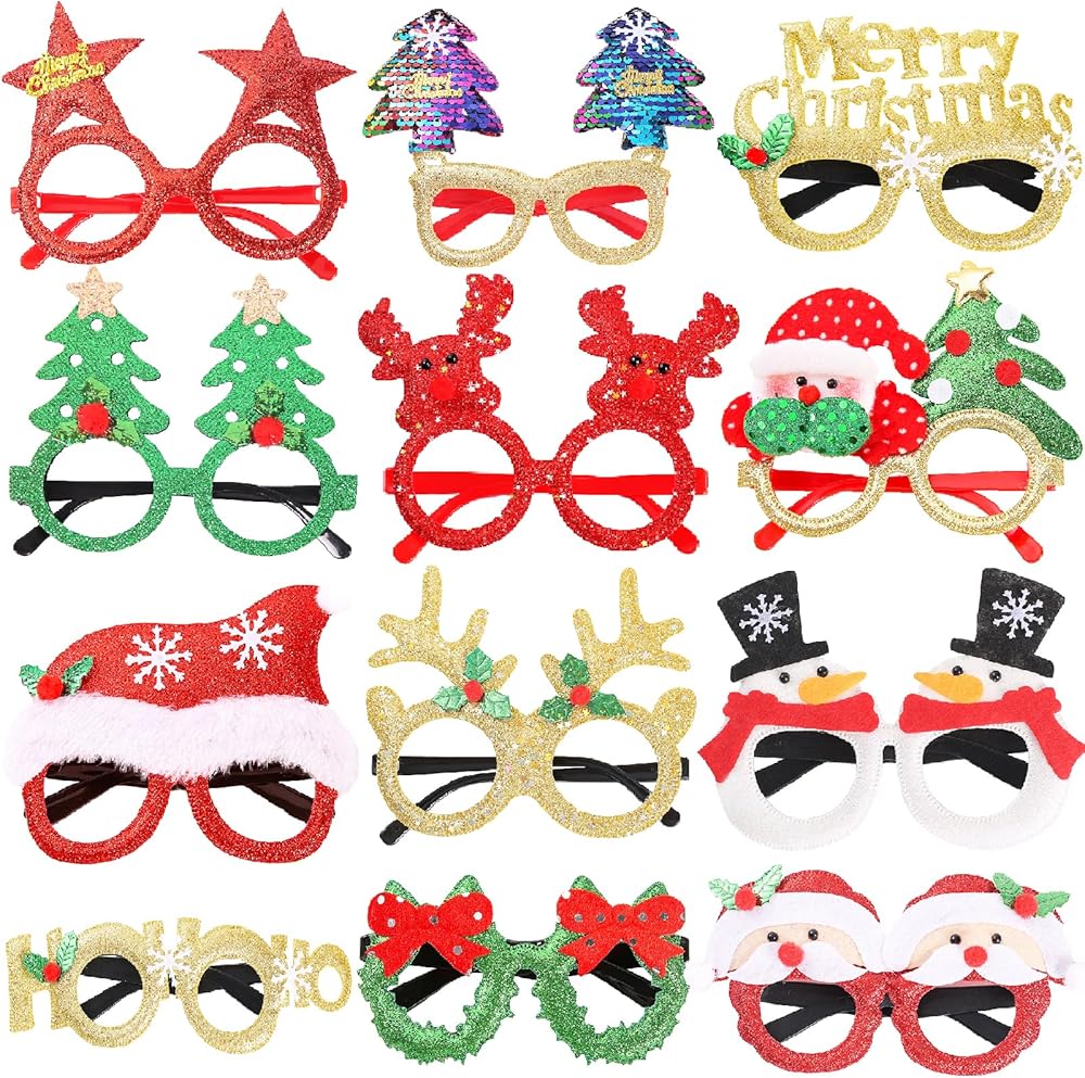 Viicoor 12 قطعة من نظارات عيد الميلاد اللامعة للحفلات مع 12 تصميمًا، وإكسسوارات زينة عيد الميلاد، نظارات تنكرية لحفلات عيد الميلاد وهدايا عيد الميلاد، هدية زينة عيد الميلاد