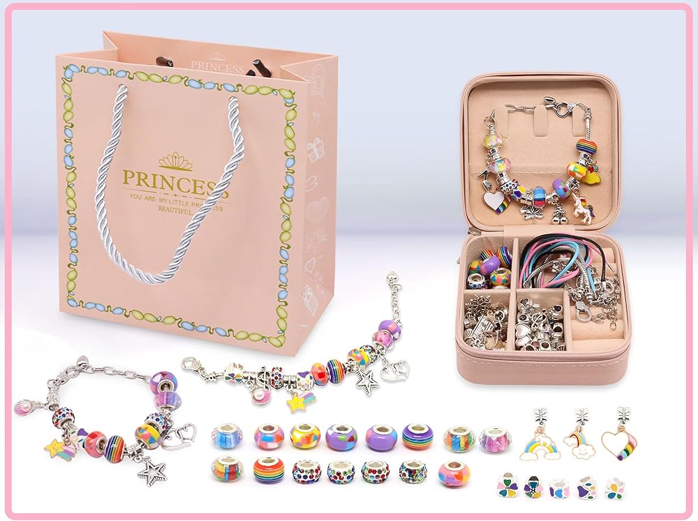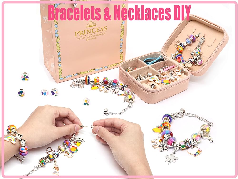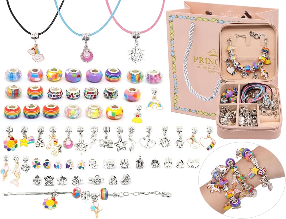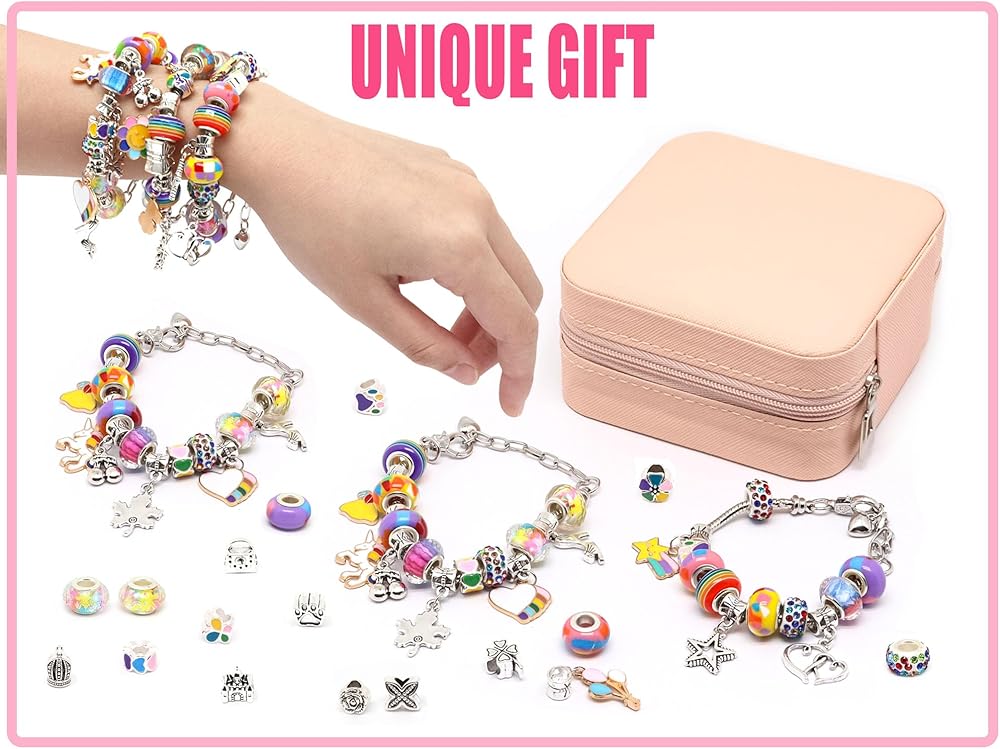 مجموعة صنع الاساور بدلايات للبنات، خرز بتصميم قوس قزح وحيد القرن مع صندوق منظم زهري للهدايا للبنات المراهقات من سن 5-12 سنة
