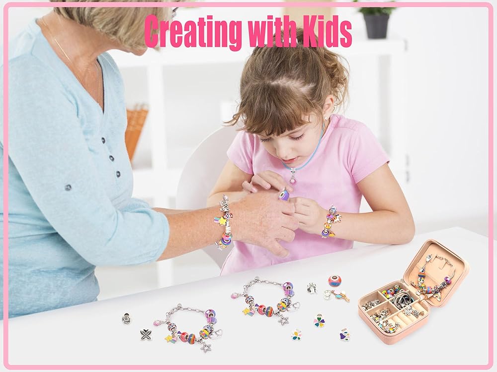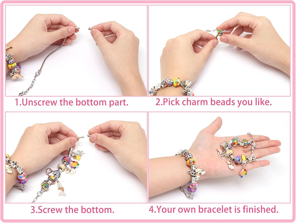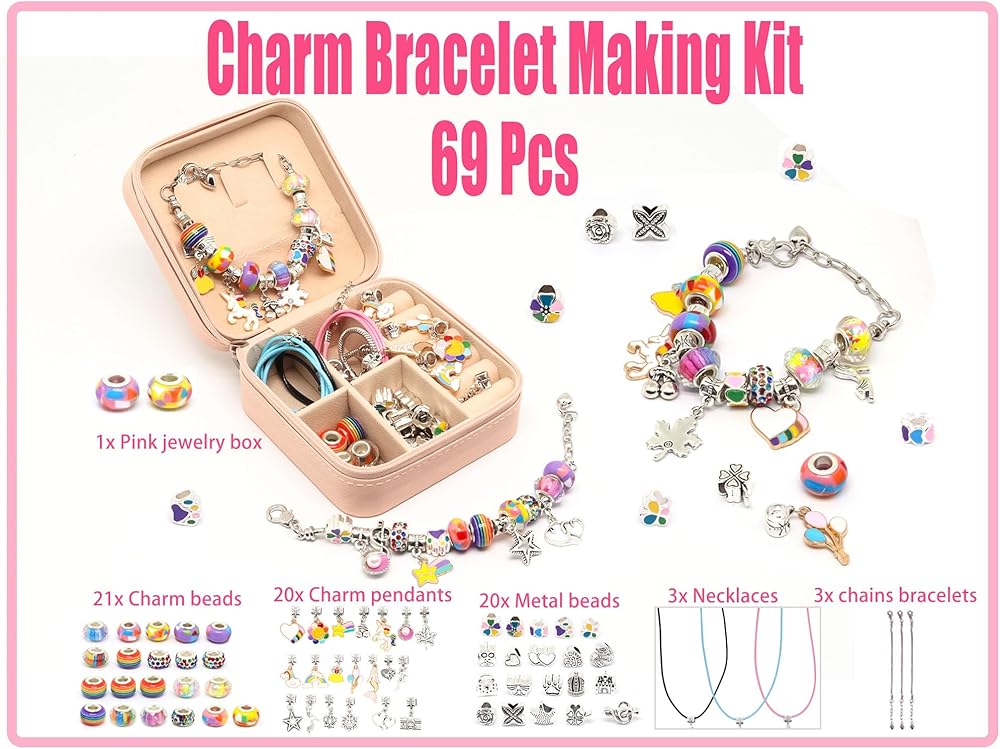 مجموعة صنع الأساور الساحرة - إجمالي 69 قطعة: 20 × خرز ساحر، 20 × قلادات ساحرة، 20 × خرز معدني، 3 × أساور سلاسل ثعبان، 3 × قلادات، 1 × صندوق مجوهرات زهري، 1 × حقيبة هدايا رائعة، 1 دليل مستخدم.