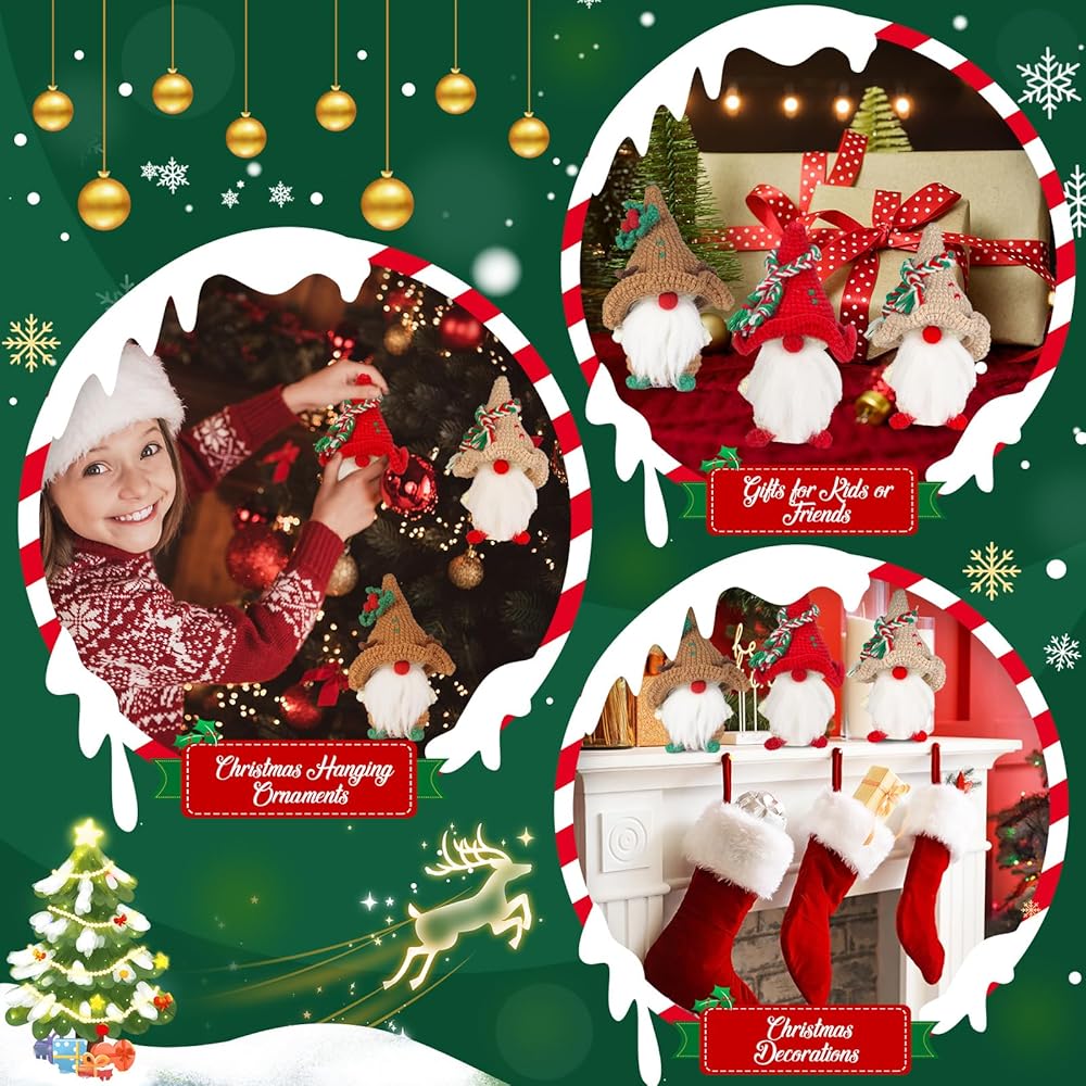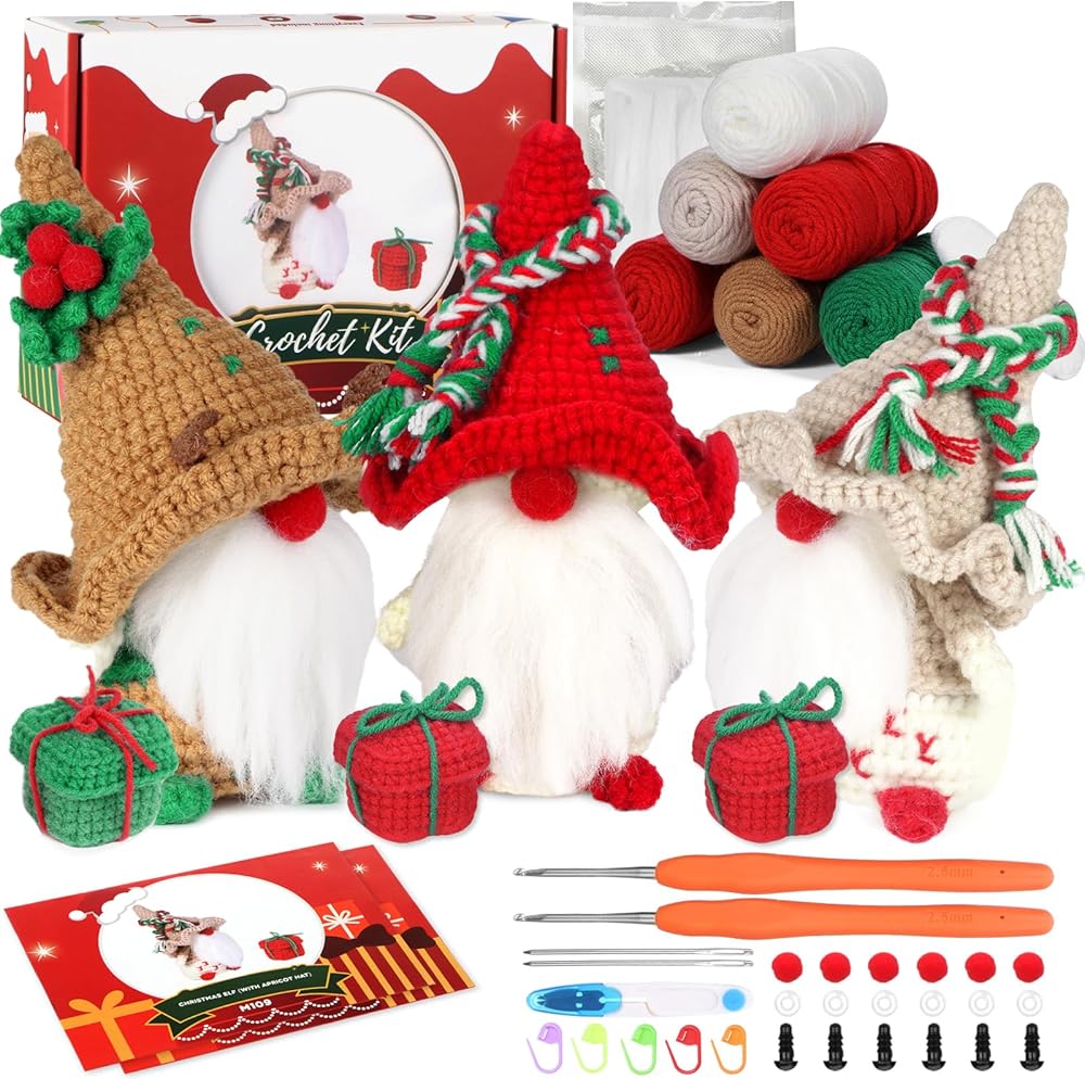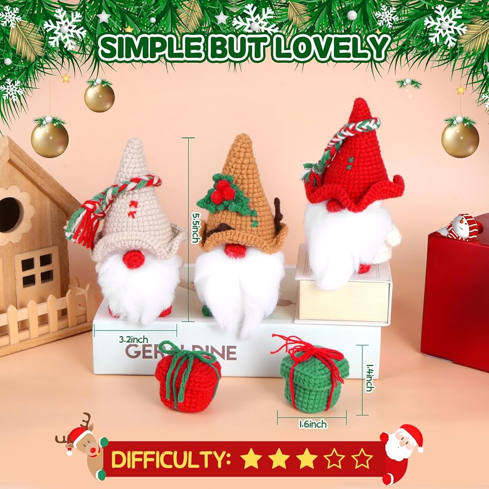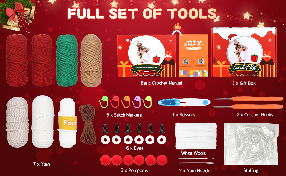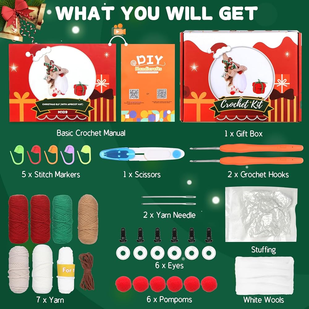 【مجموعة كروشيه كاملة لعيد الميلاد】سوف تحصل على 6 خيوط كروشيه ملونة، وحشو وافر، وخطافي كروشيه، وإبرتين، و6 عيون أمان، و5 أقلام تحديد غرز، ومقص واحد، و6 كرات، وتعليمات وفيديو مناسبة للمبتدئين، كلها في صندوق هدايا. باستخدام هذه المواد، يمكنك صنع 3 قطع من دمى أقزام عيد الميلاد و3 قطع من علب الهدايا الصغيرة.