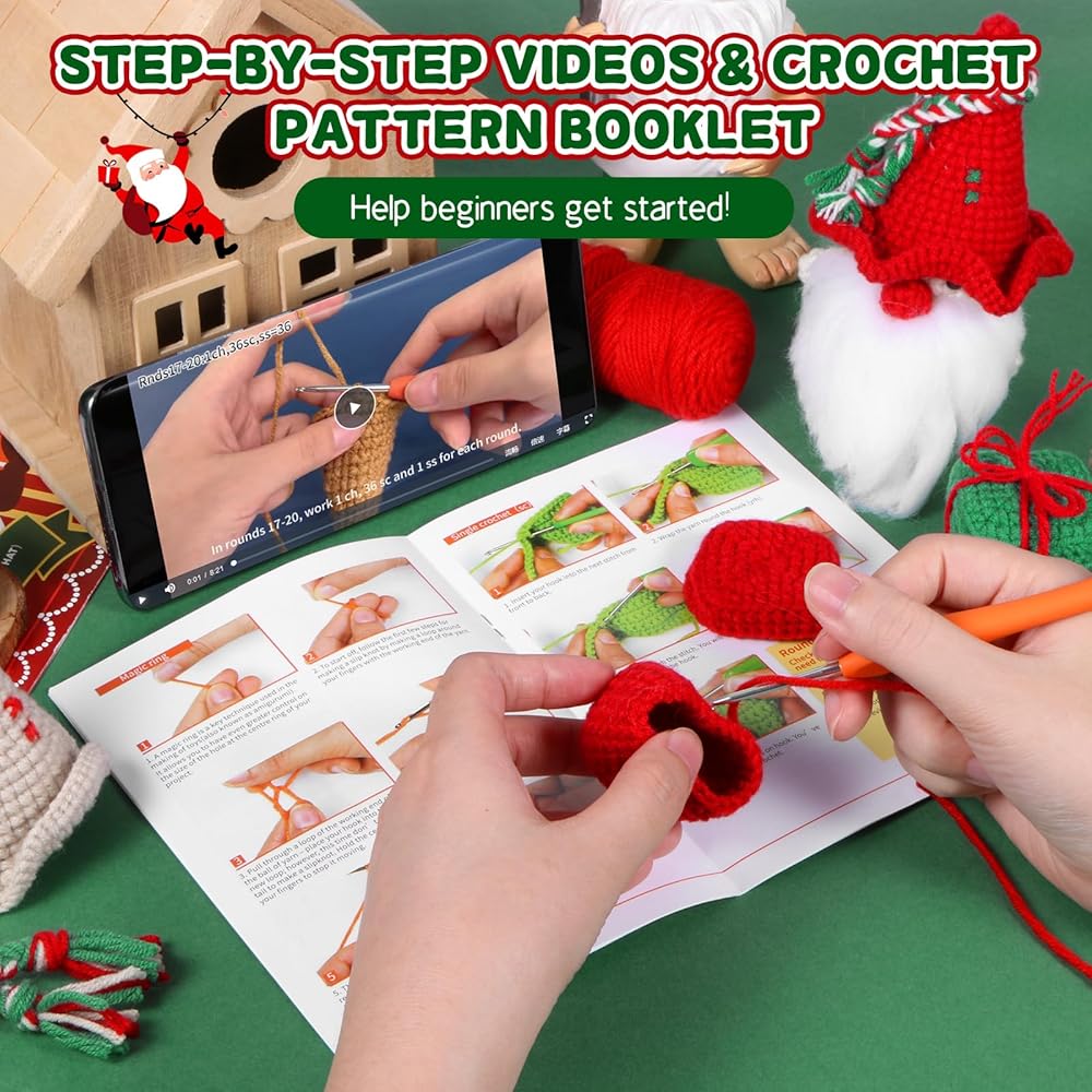 【دروس فيديو خطوة بخطوة】تأتي مجموعة الكروشيه الخاصة بنا للمبتدئين والكبار مع تعليمات مطبوعة بالألوان وفيديو سهل المتابعة للمبتدئين للبدء بسرعة. إذا كنت تريد أن تتعلم شيئًا جديدًا في الكروشيه ولكن ليس لديك أي خبرة، فإن مجموعة أدوات الكروشيه الخاصة بنا للمبتدئين لموضوع عيد الميلاد هي مجموعة أدوات كروشيه رائعة وسهلة التعلم.
