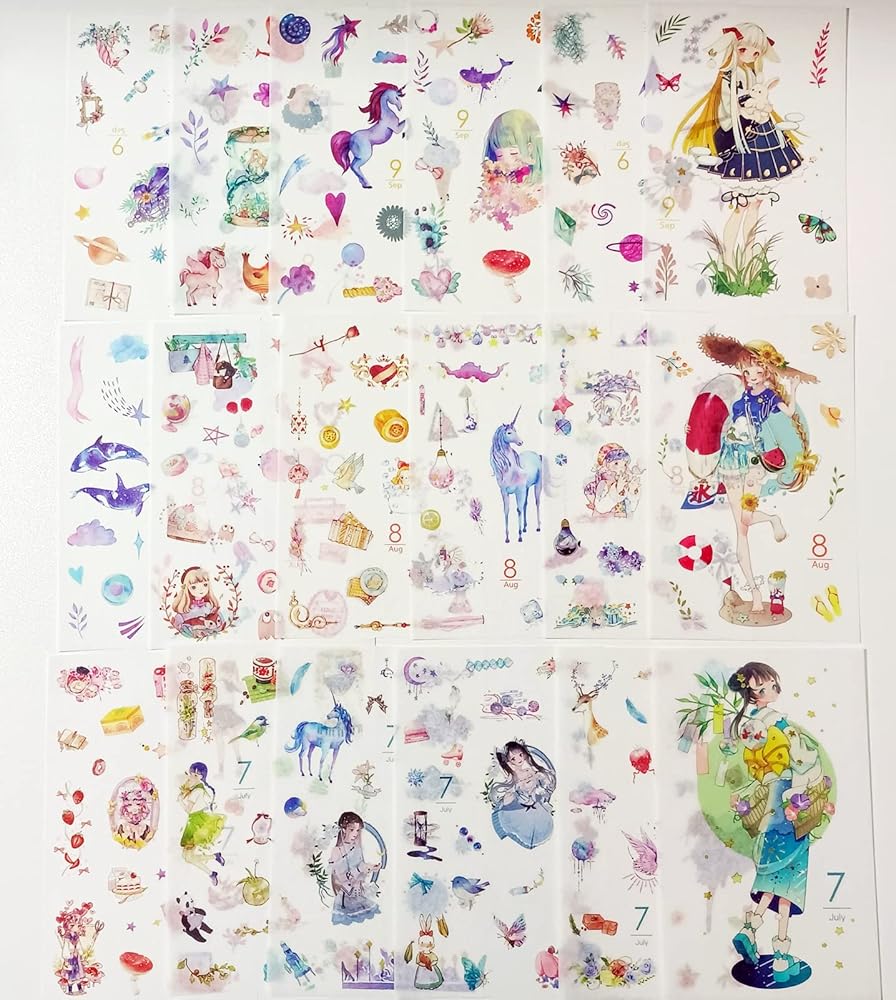 الحجم والكمية - سوف تحصل على 72 ورقة ملصقًا. موضوعات لمدة 12 شهرًا، كل 6 أوراق، 72 تصميمًا مختلفًا، بدون تكرار. حجم الورقة: تقريبًا. 16 سم × 10 سم / 6.29 × 3.93 بوصة