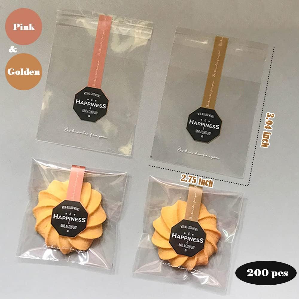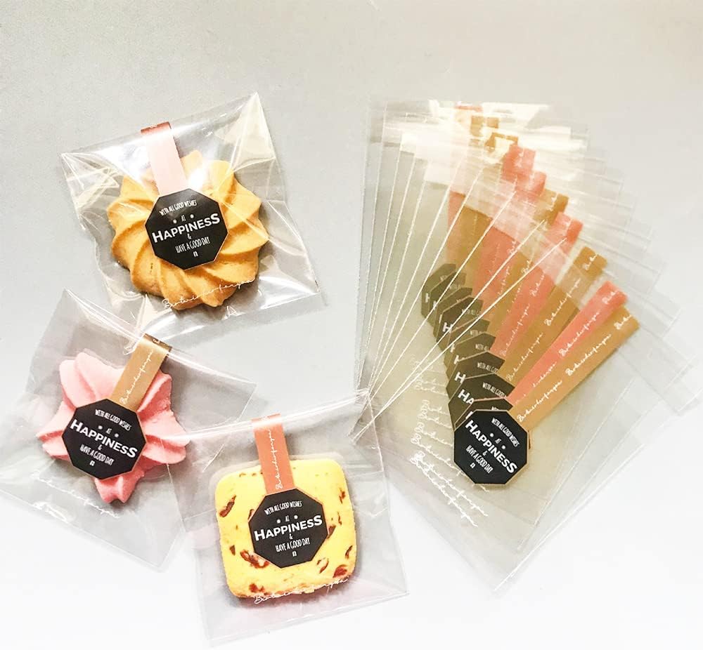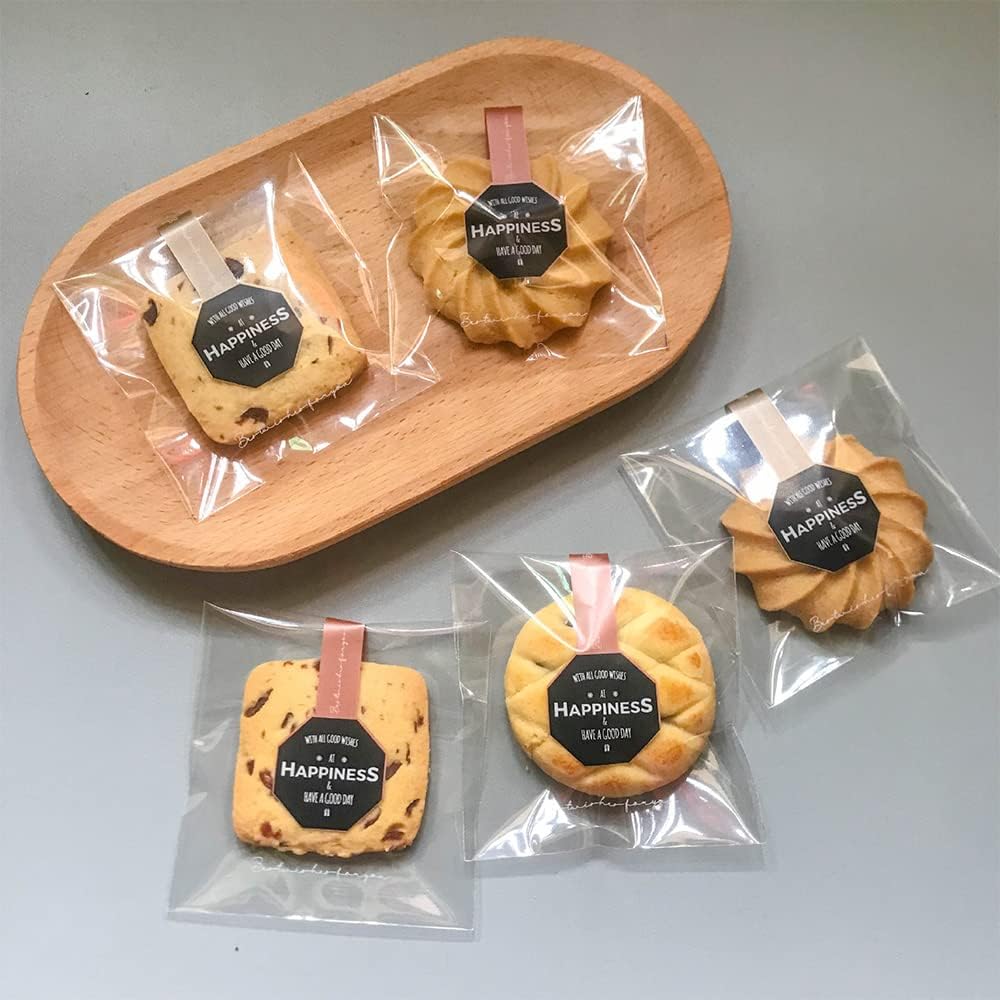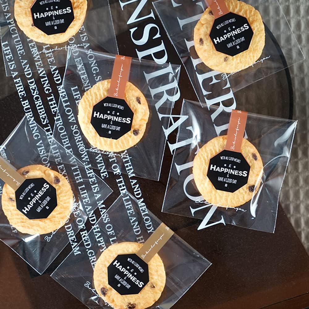 أكياس ملفات تعريف الارتباط ذاتية اللصق من السيلوفان، 200 قطعة مقاس 2.75x2.75 في أكياس ملفات تعريف الارتباط للتغليف مع طباعة "HAPPINESS" لحفلات تقديم هدايا حلوى المخبوزات (QS62)