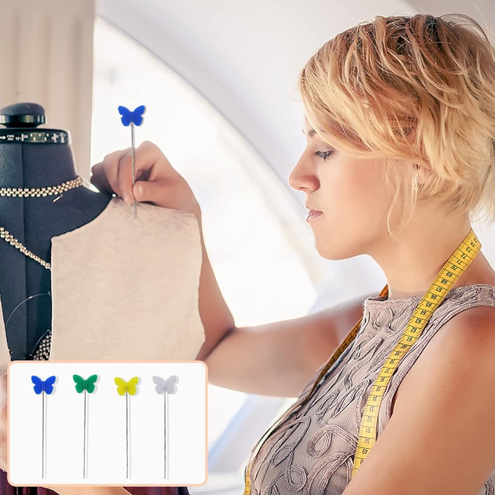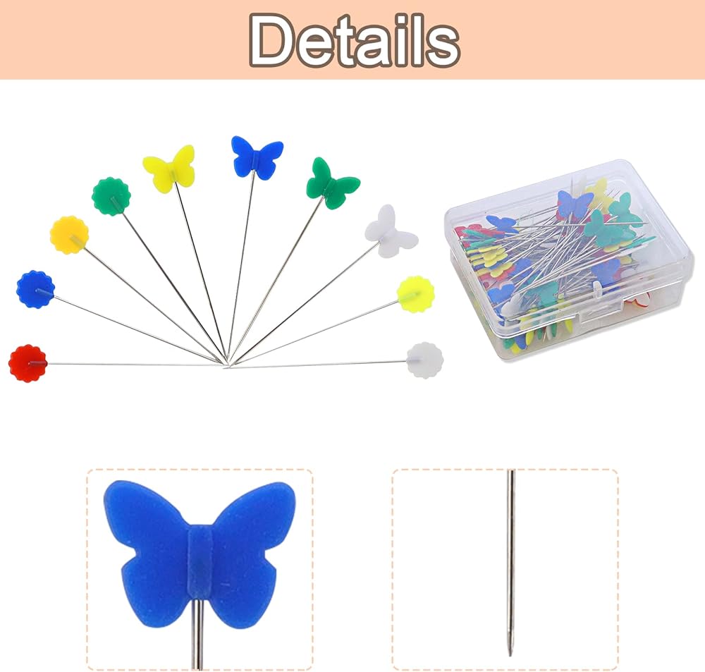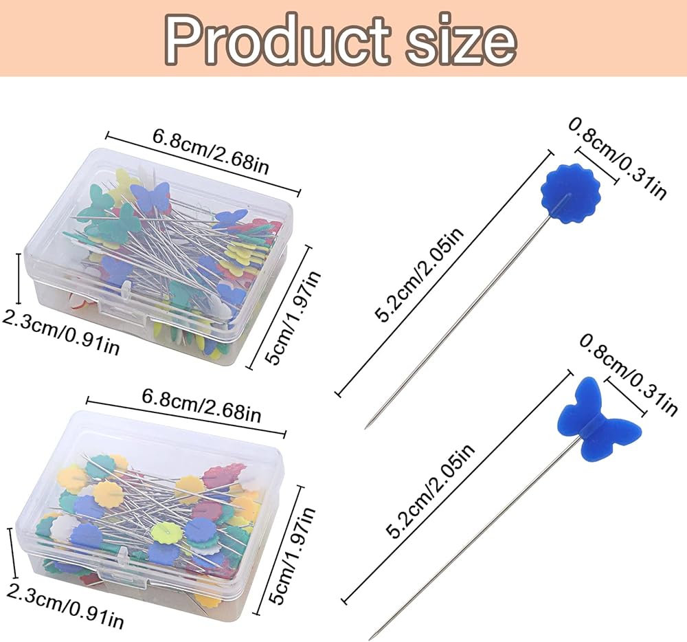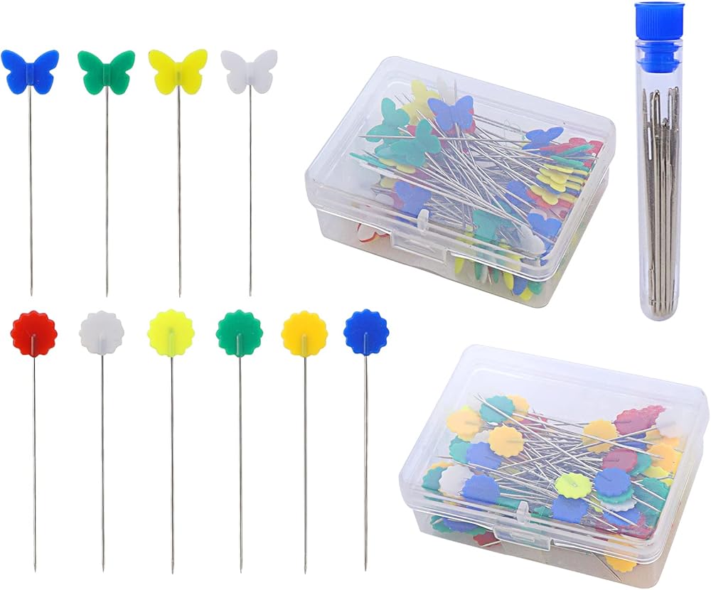 إبر خياطة العين الكبيرة ودبابيس الخياطة من HengKe، دبابيس مستقيمة ذات رأس مسطح مع رؤوس ملونة على شكل فراشة وزهرة، مجموعة دبابيس خياطة بإبرة مطرزة من الجلد (30 إبرة، 200 دبابيس مسطحة)