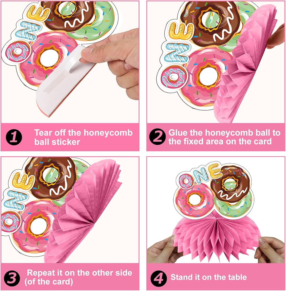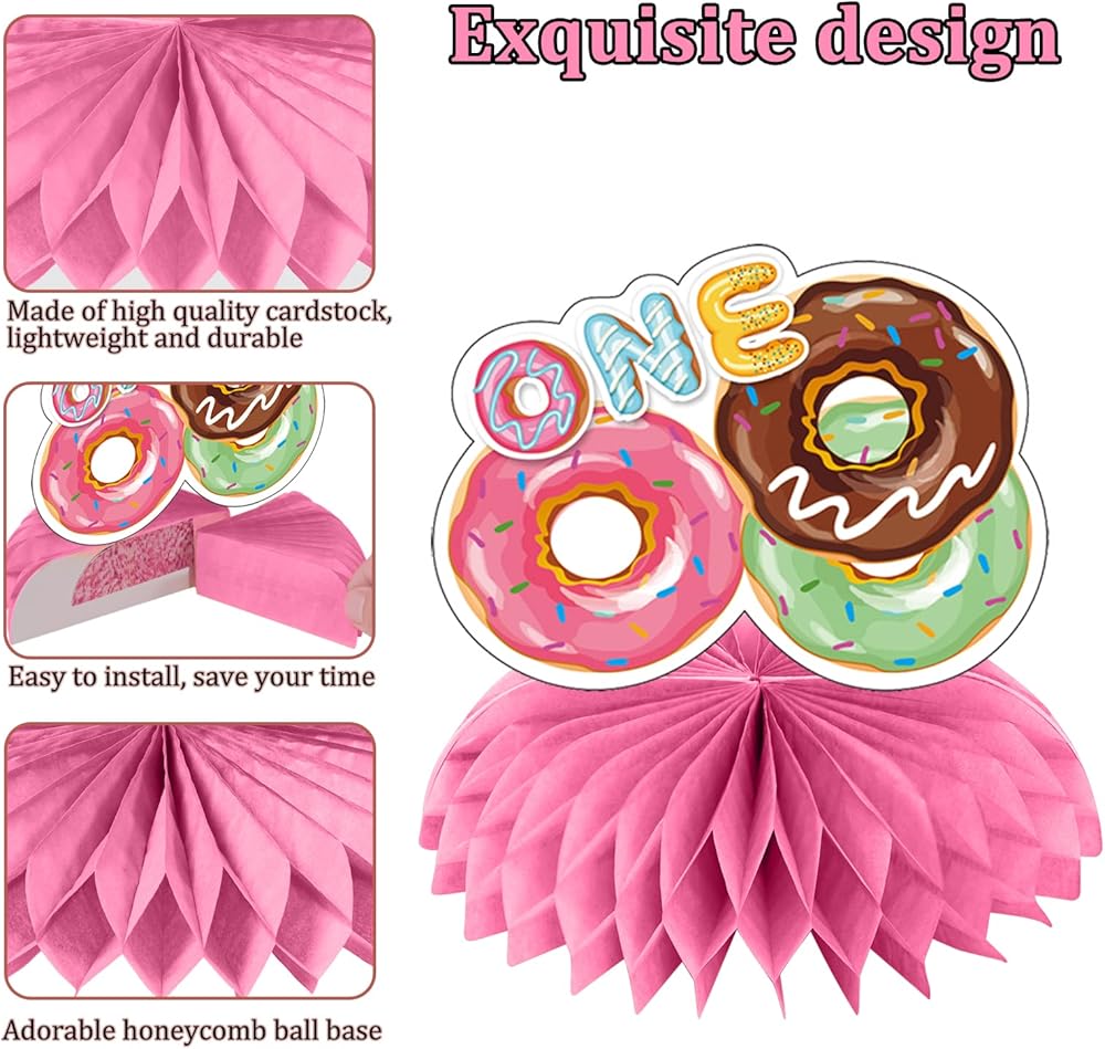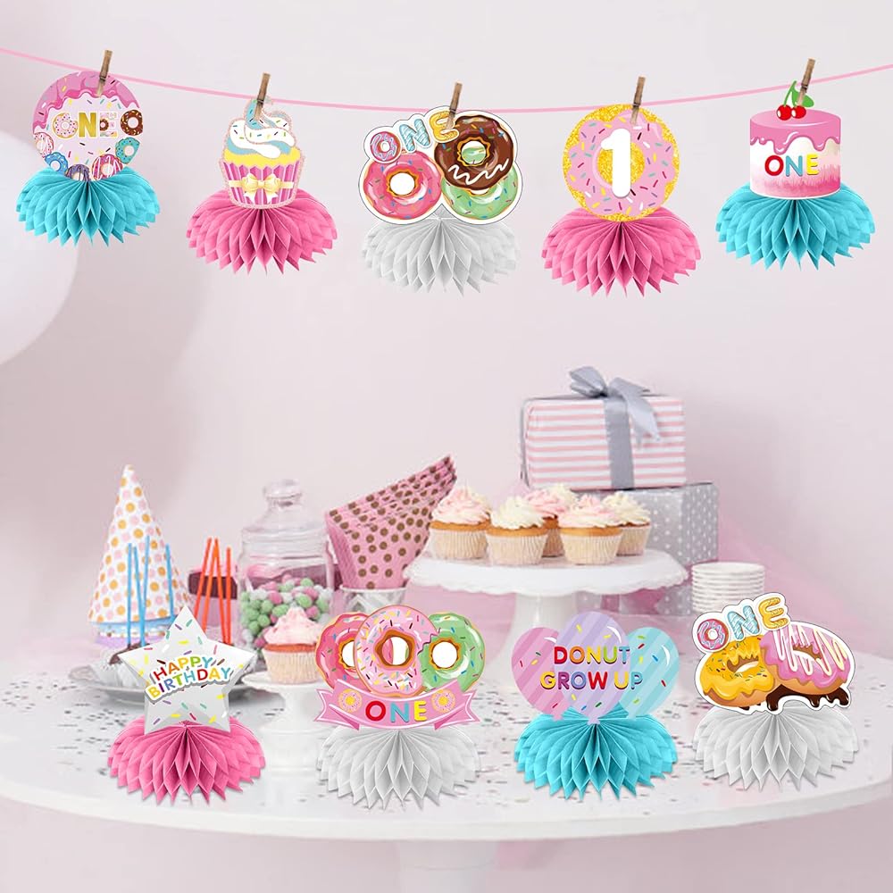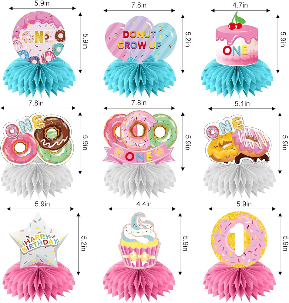 [You will get] - 9pcs donut 1st birthday party supplies table honeycomb centerpieces, 9 different styles, rich and varied patterns, enough to decorate your child's one year old birthday donut theme party.