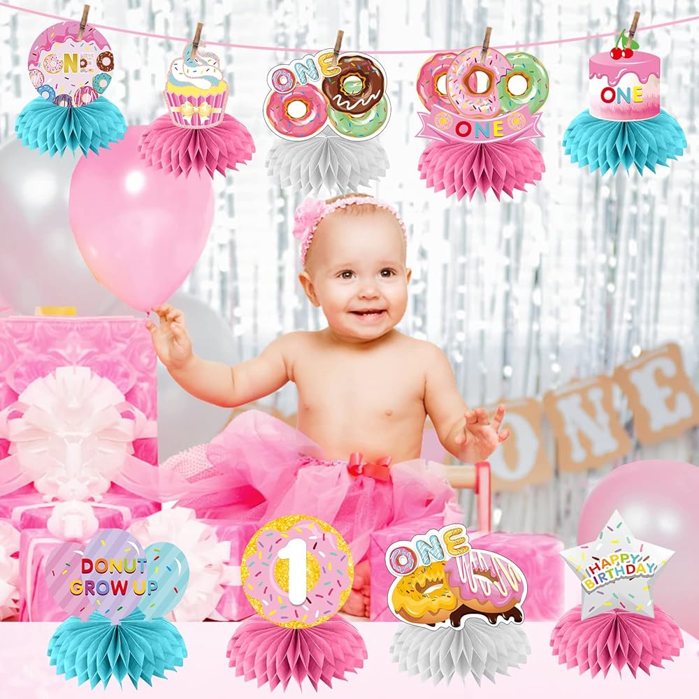 [Doughnut theme] - Pink, blue, white honeycomb base design, matching donuts, cakes, stars, balloons and other patterns with the words "ONE", "Donut Grow up", "Happy Birthday" written on them, the colors are very suitable for donut birthday theme party, is a great choice to celebrate your daughter's first birthday.
