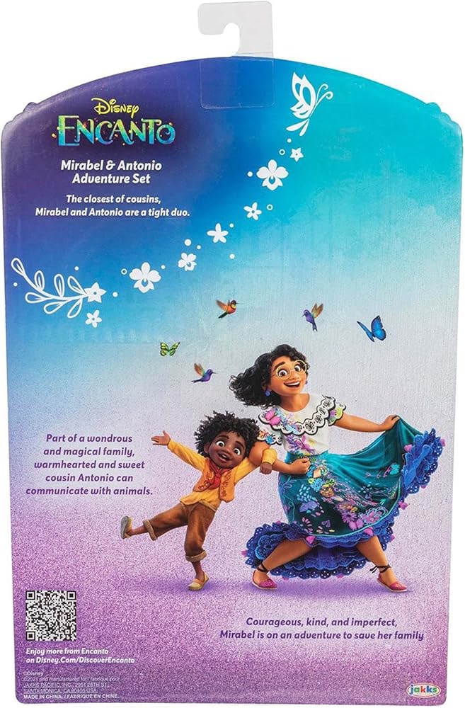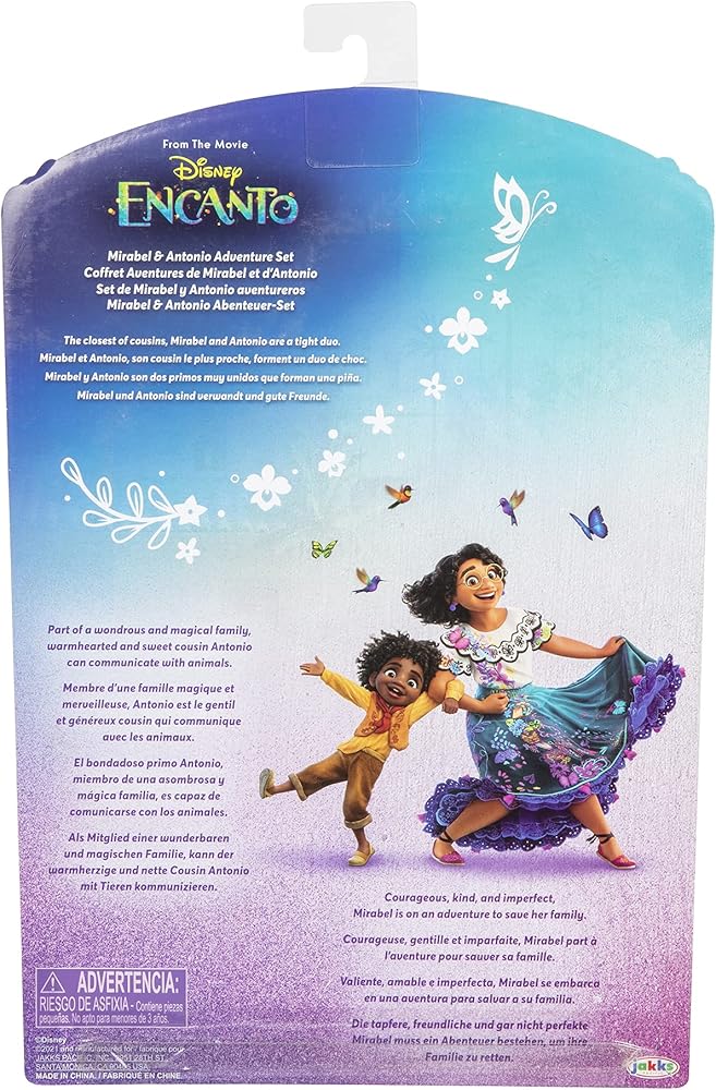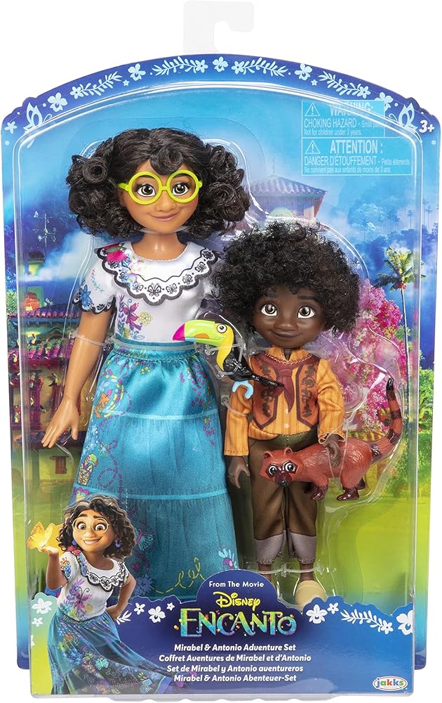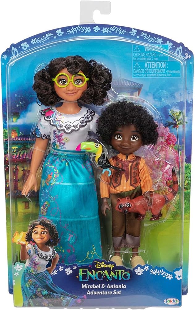 الفيلم الستين لاستوديو والت ديزني للرسوم المتحركة، Encanto، يحكي قصة عائلة غير عادية، Madrigals، الذين يعيشون مختبئين في جبال كولومبيا، في منزل سحري، في بلدة نابضة بالحياة، في مكان ساحر ورائع يسمى Encanto. لقد بارك سحر إنكانتو كل طفل في العائلة بهدية فريدة من القوة الفائقة إلى القدرة على شفاء كل طفل باستثناء طفل واحد، ميرابيل. ولكن عندما تكتشف أن السحر المحيط بـ Encanto في خطر، تقرر ميرابيل أنها، المادريجال العادية الوحيدة، قد تكون مجرد الأمل الأخير لعائلتها الاستثنائية. انطلق في مغامرة مع شخصياتك المفضلة من ديزني إنكانتو مع مجموعة مغامرات ميرابيل وأنطونيو! ميرابيل وأنطونيو، أقرب أبناء العمومة، هما ثنائي متماسك يشتركان في رابطة صداقة خاصة. تأتي هذه الدمى مرتدية ملابسها وإكسسواراتها المميزة من الفيلم! يتميز فستان ميرابيل بياقة وأكمام صدفية جميلة مع تصميمات مطرزة أصلية. ألقي نظرة فاحصة على التصاميم، وستجد اسم ميرابيل مطبوعًا على تنورتها، تمامًا مثل فستانها في إنكانتو! نظارتها الخضراء الزاهية، وأقراط بوم بوم الأرجوانية، وحذاء الإسبادريل الأرجواني تكمل مظهرها الكلاسيكي. يرتدي أنطونيو ملابسه وحذائه البرتقالي المميز، ويأتي مع بيكو وصديقه كواتي! العب مشاهد من الفيلم حيث يغامر ميرابيل وأنطونيو في إنكانتو لإنقاذ سحر مادريجالز!