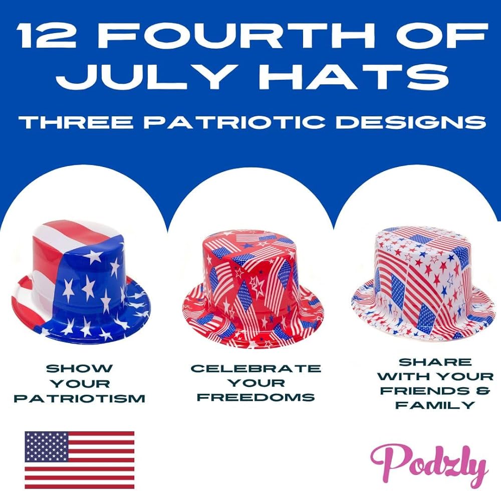 Podzly 12 لوازم حفلات قبعة العلم الأمريكي - قبعات وطنية للرابع من يوليو لعيد الاستقلال - ملحقات حفلات الولايات المتحدة الأمريكية باللونين الأحمر والأبيض والأزرق للأطفال والكبار