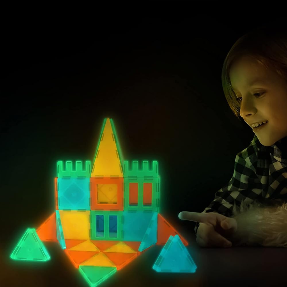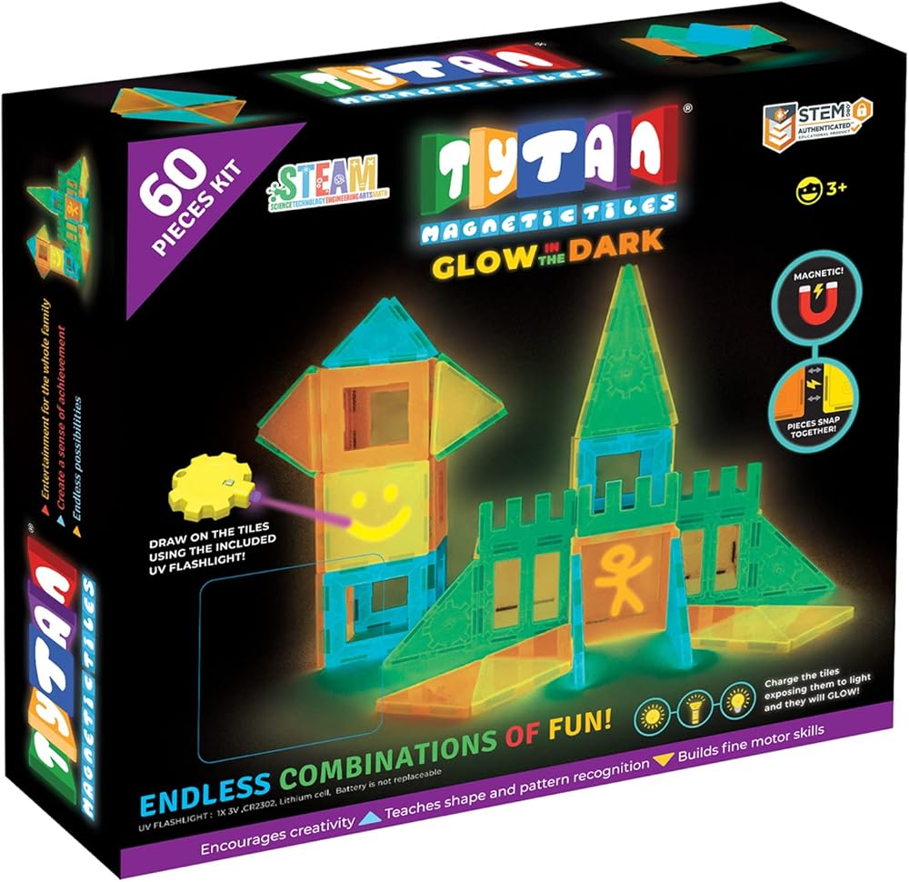 تيتان مجموعة بناء بلاط مغناطيسي تتوهج في الظلام مكونة من 60 قطعة، اشكال متنوعة متعددة الالوان، لعبة ستيم، سيارات، لعب ابداعي، شنطة تخزين وسلسلة مفاتيح ومصباح يدوي بالاشعة فوق البنفسجية للرسم على