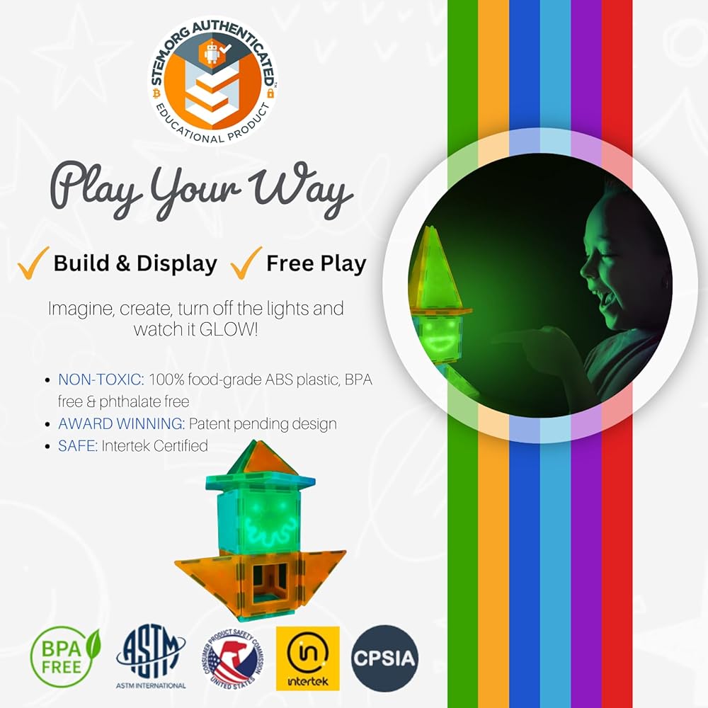 😊 تتضمن - 1 مجموعة بناء مغناطيسية من 60 قطعة من البلاط المتوهج 2.0 ومصباح يدوي بسلسلة مفاتيح بالأشعة فوق البنفسجية وحقيبة حمل لسهولة الحمل والتخزين الخالي من الإجهاد. تم اختباره من قبل الوالدين، وأعلى مستوى من شهادات سلامة الأطفال CPSA CPSA. اشحن البلاطات الخاصة بك لتعريضها للضوء وستتوهج بالتأكيد!