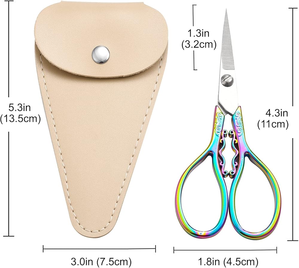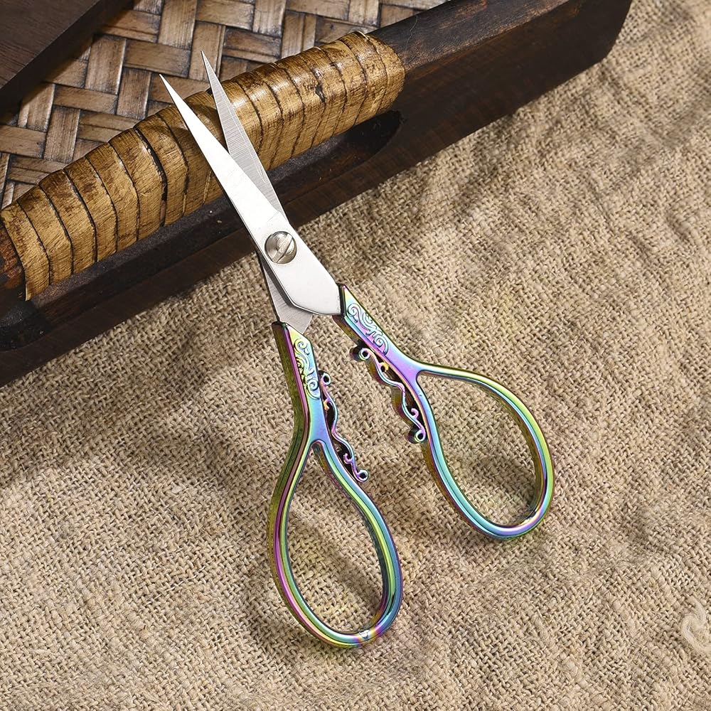 مقصات قصاصات ذات نمط عتيق مصممة بمقابض مريحة بألوان قوس قزح، يمكن استخدامها باليد اليمنى أو اليسرى، سهلة الإمساك، مقص قوس قزح ذو حافة مدببة وشفرات حادة، مع زوج حاد من المقصات الصغيرة هو لعبة سهلة التطريز