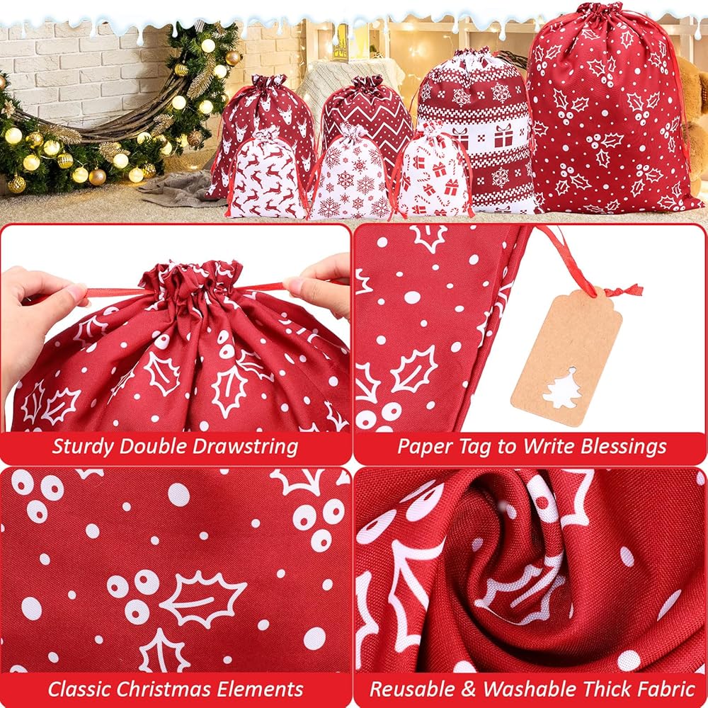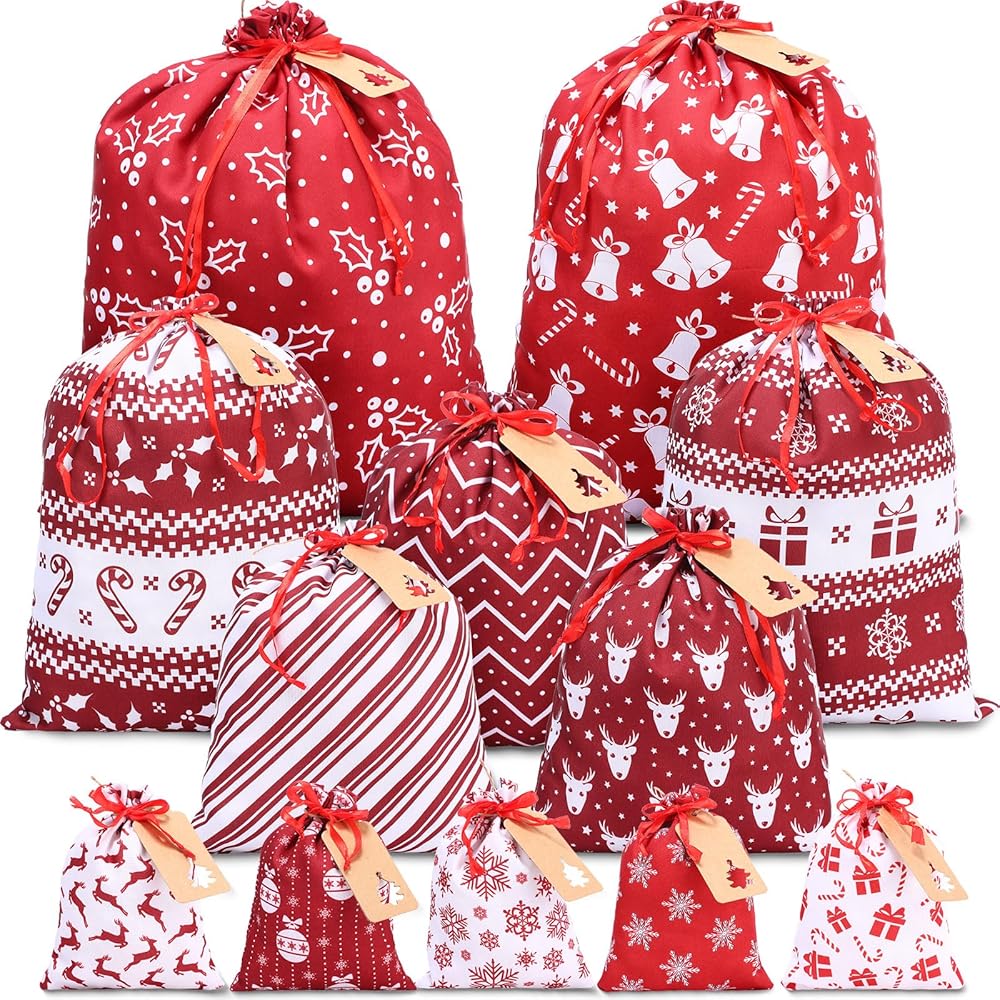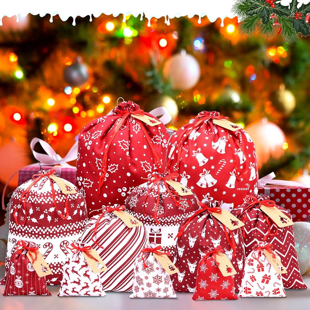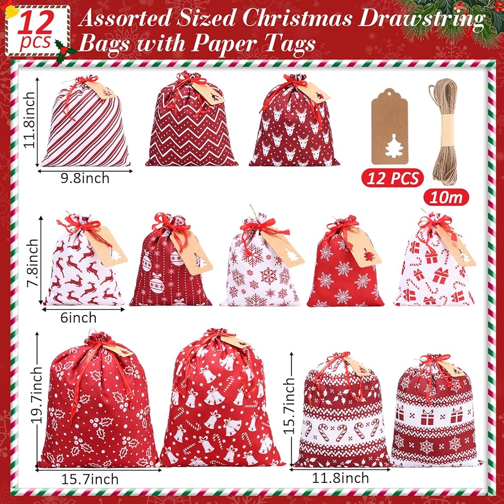 12 قطعة من أكياس هدايا عيد الميلاد برباط من Abbylike، مقاسات متنوعة، أكياس عيد الميلاد قابلة لإعادة الاستخدام، أكياس قماش من القماش سانتا جودي مع العلامات والحبال من أجل هدايا حفلات العطلات، مقاس كبير متوسط صغير (كلاسيكي)