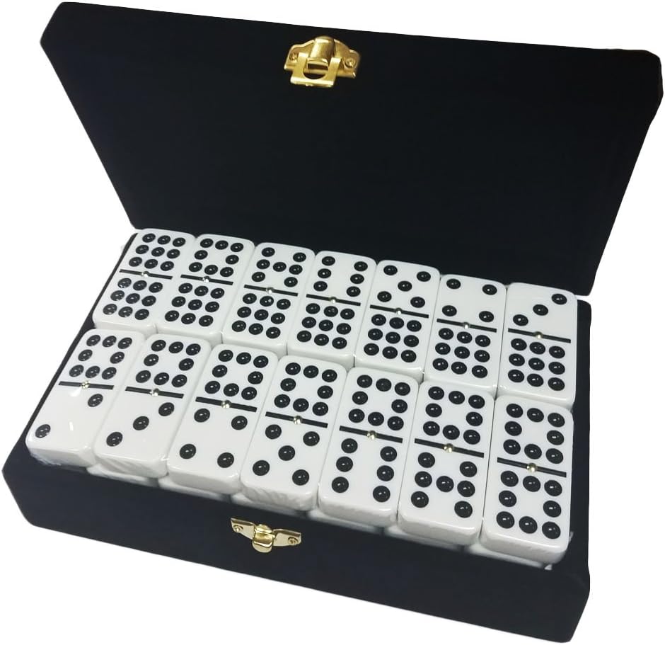 مجموعة واحدة مزدوجة من تسعة قطع من الدومينو (55 قطعة مع دوارات) باللون الأحمر مع بقع بيضاء. حجم البطولة الكبير (2 بوصة × 1 بوصة × 1/2 بوصة). يأتي في صندوق خشبي شيشام أنيق مع مفاصل متوافقة.