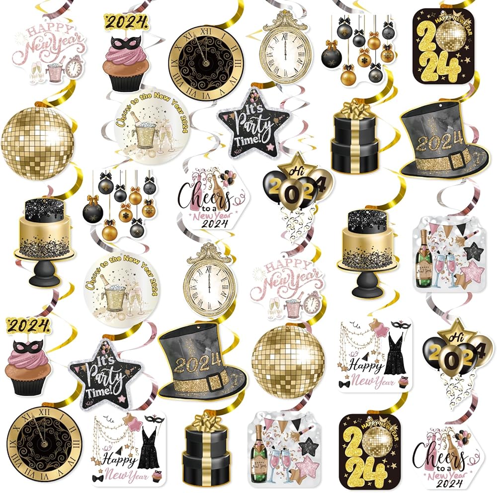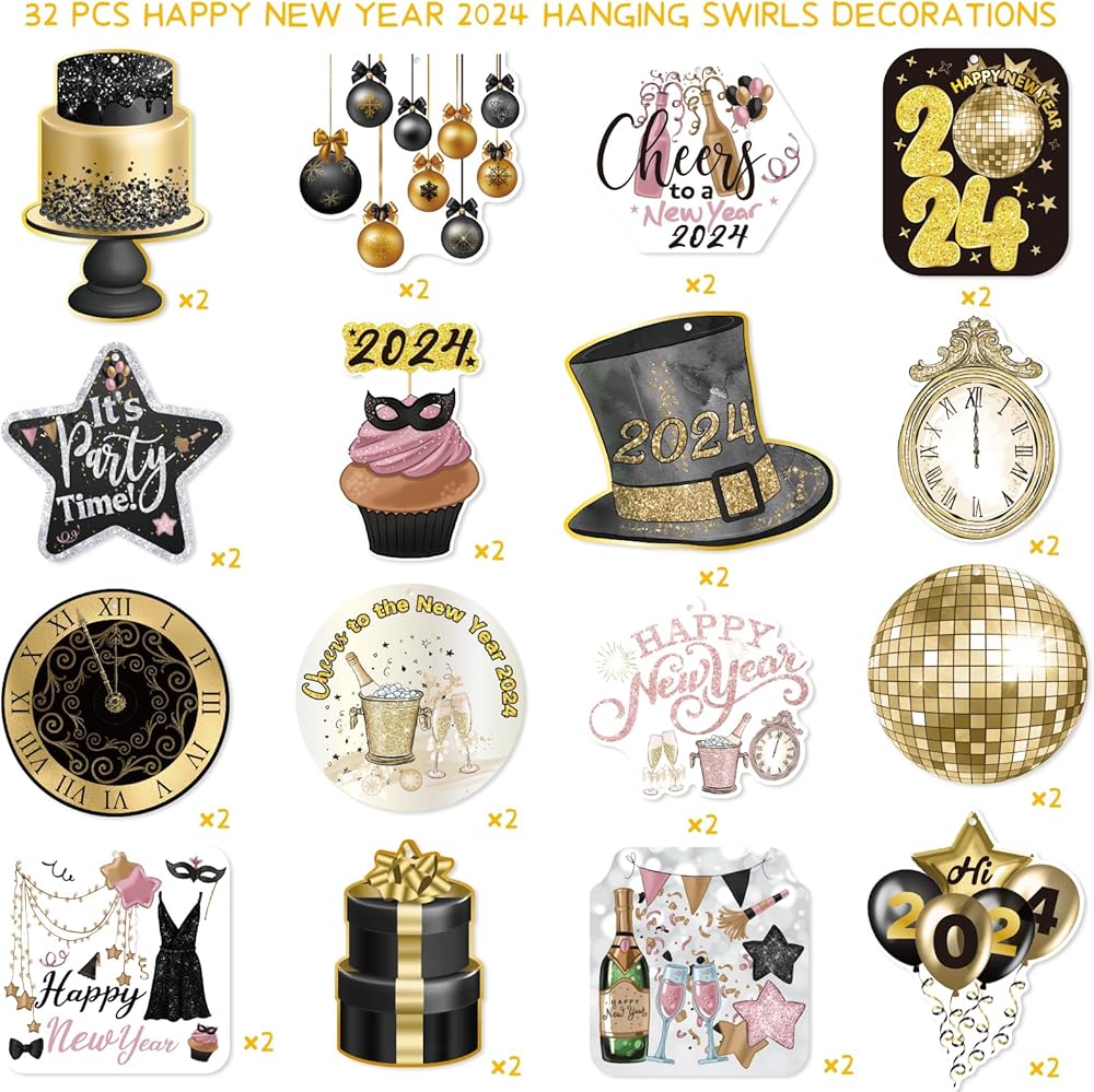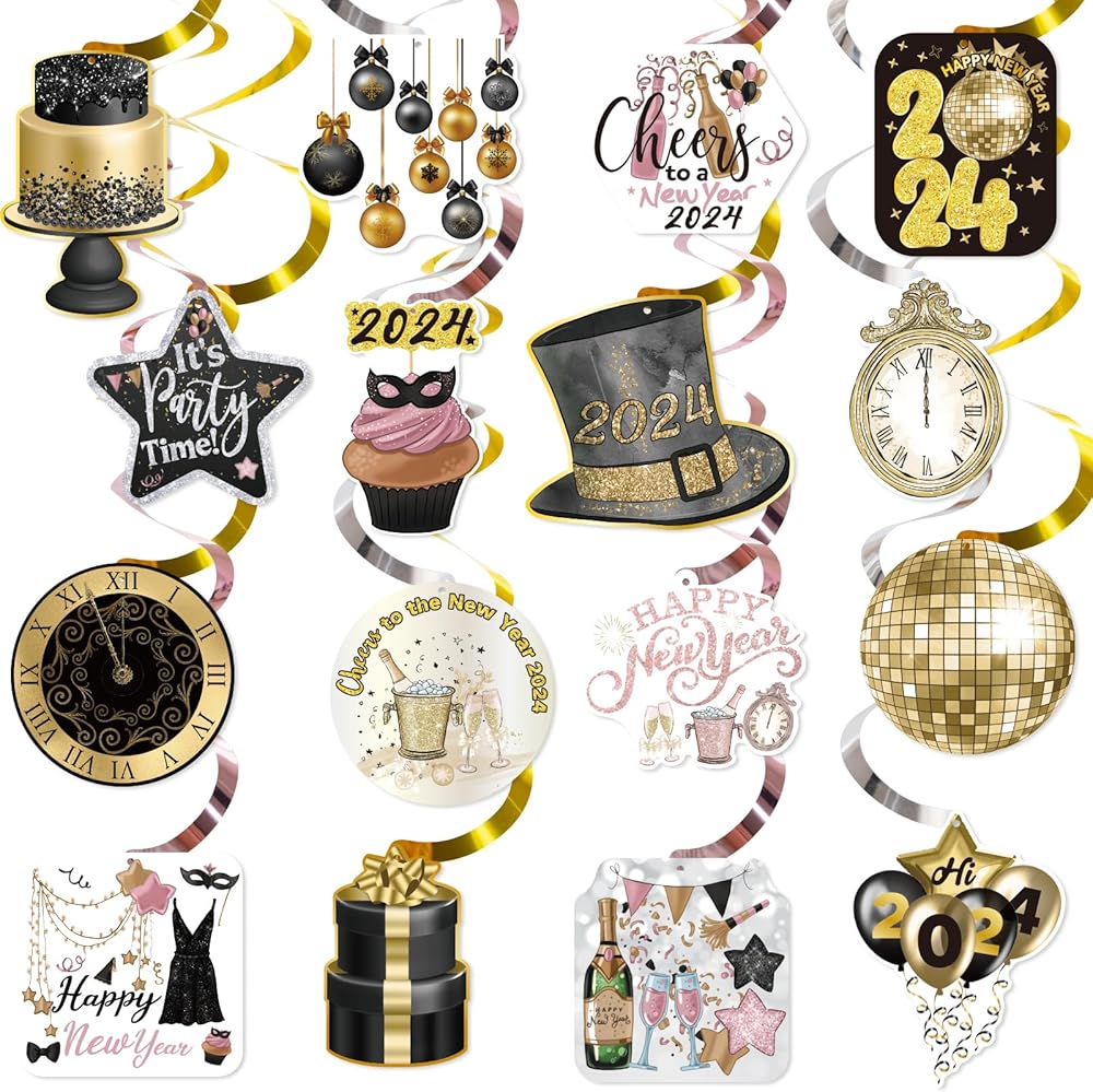 زينة سنة جديدة سعيدة 2024 ليلة رأس السنة الجديدة لوازم الحفلات سقف معلق الدوامات 32 قطعة لا يمكنك صنعها بنفسك اللافتات الذهب الأسود ديكور السنة الجديدة