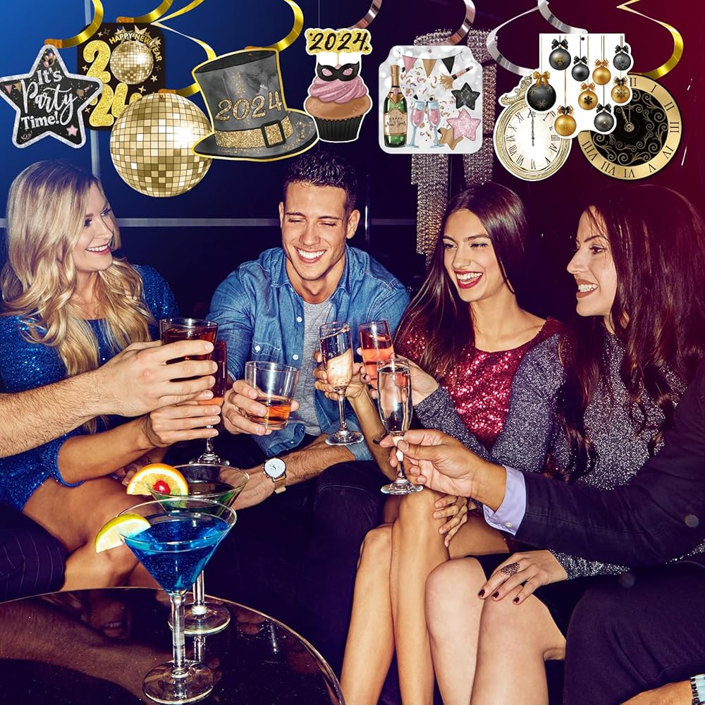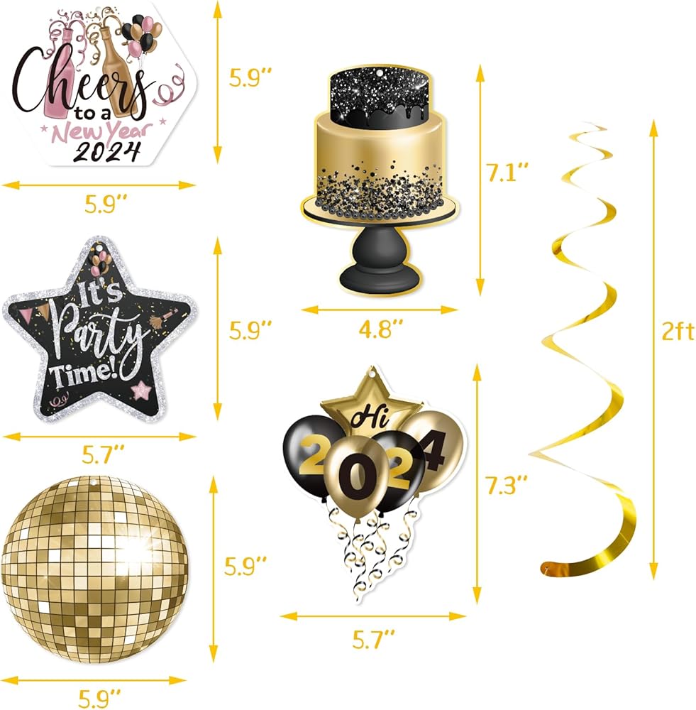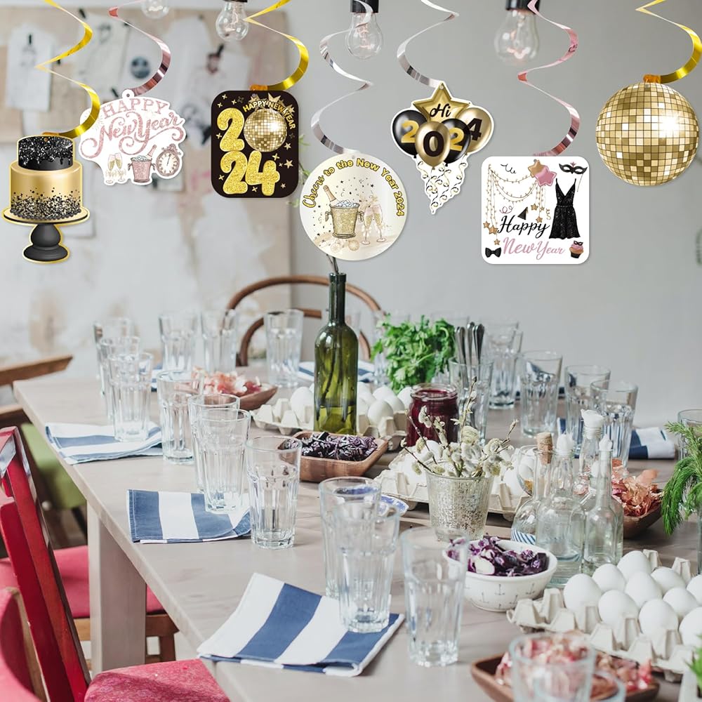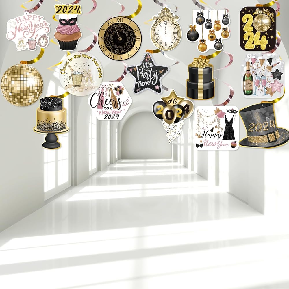 زينة سنة جديدة سعيدة 2024 ليلة رأس السنة الجديدة لوازم الحفلات سقف معلق الدوامات 32 قطعة لا يمكنك صنعها بنفسك اللافتات الذهب الأسود ديكور السنة الجديدة