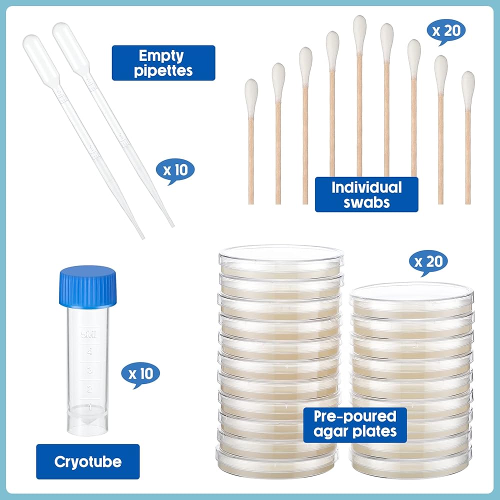 Science Project Kit: the package contains 20 pieces of petri dishes with agar (9 cm/ 3.54 inches in diameter), 20 pieces of cotton swabs, 10 pieces of 2 ml droppers and 10 pieces of 5 ml storage tubes, a nice kit to meet your kids' needs for scientific experience