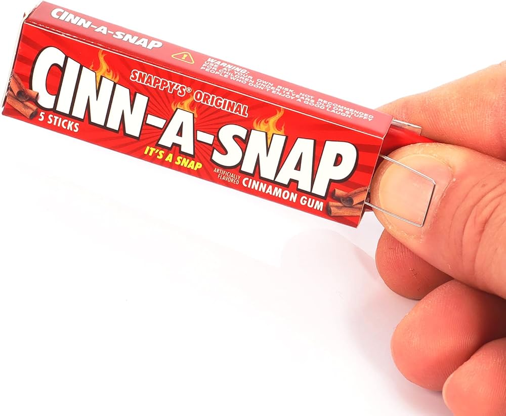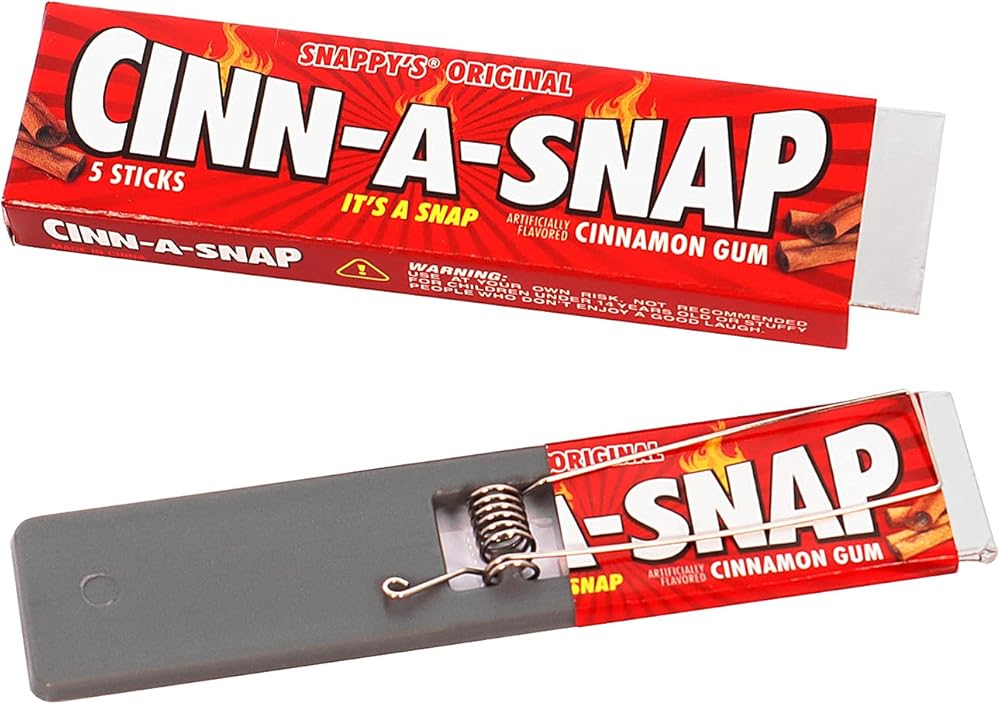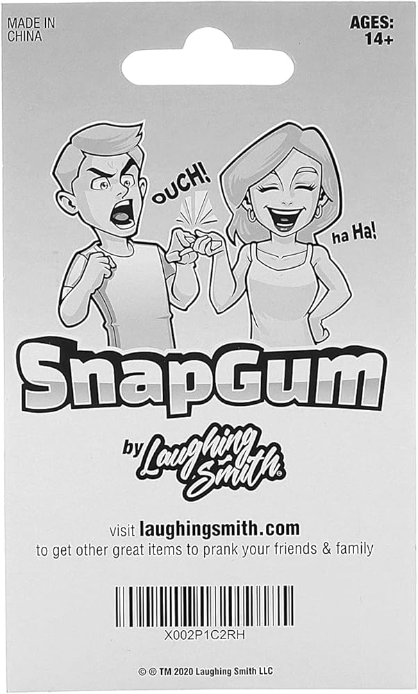 • "تغمر" أصابع الضحايا عندما يسحبون هنا" - فالصيدة المحملة بنابض داخل صممتنا الواقعية الفائقة للمضغ عند سحبهم لعلكة اللثة من العبوة. يوفر صدمة وهمية فائقة مقارنةً بصمغ زاب الكهربائي لأنه لا يتطلب بطاريات!