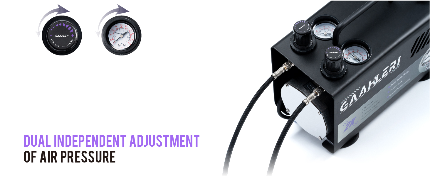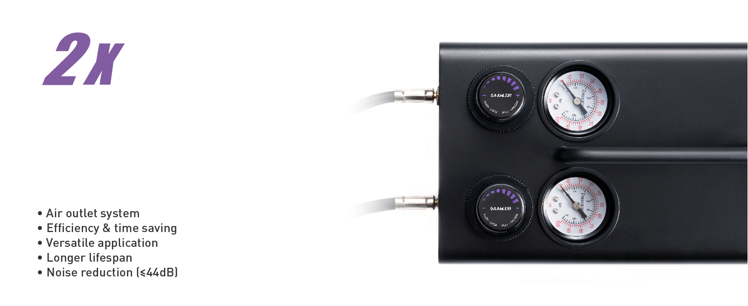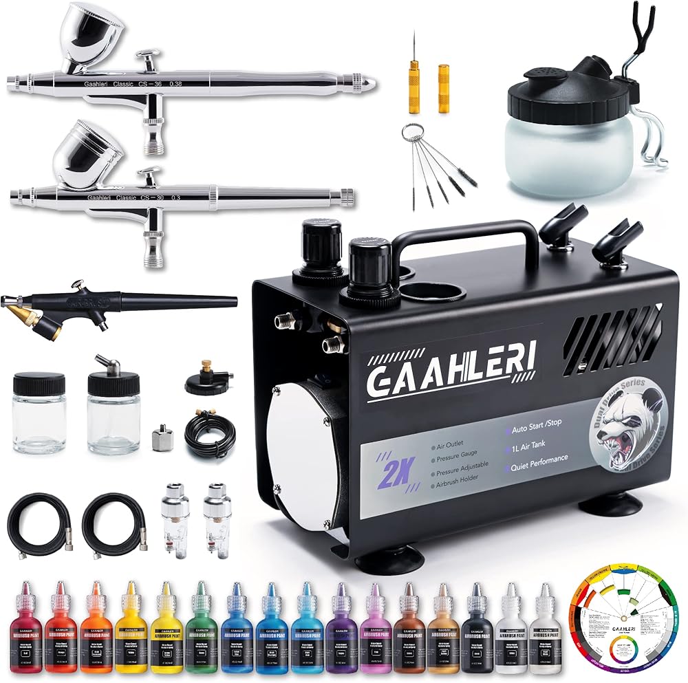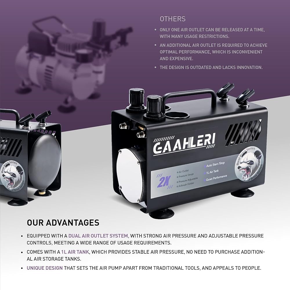 [ Beyond Professional & Comprehensive Upgrade ] Gaahleri introduces its innovative Professional Dual-Drive Airbrush design with 2 enhanced airbrush guns. Our compressor features a dual air outlet system and an attached 1L air tank, providing a wider range of applications and a more stable airflow. Besides, this kit includes 16 primary colors, and an airbrush cleaning kit. Everything you need for creative work is included, eliminating the need for additional purchases.