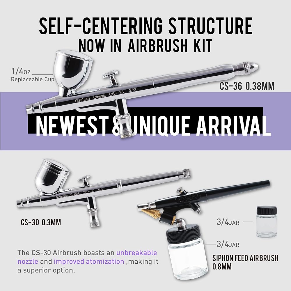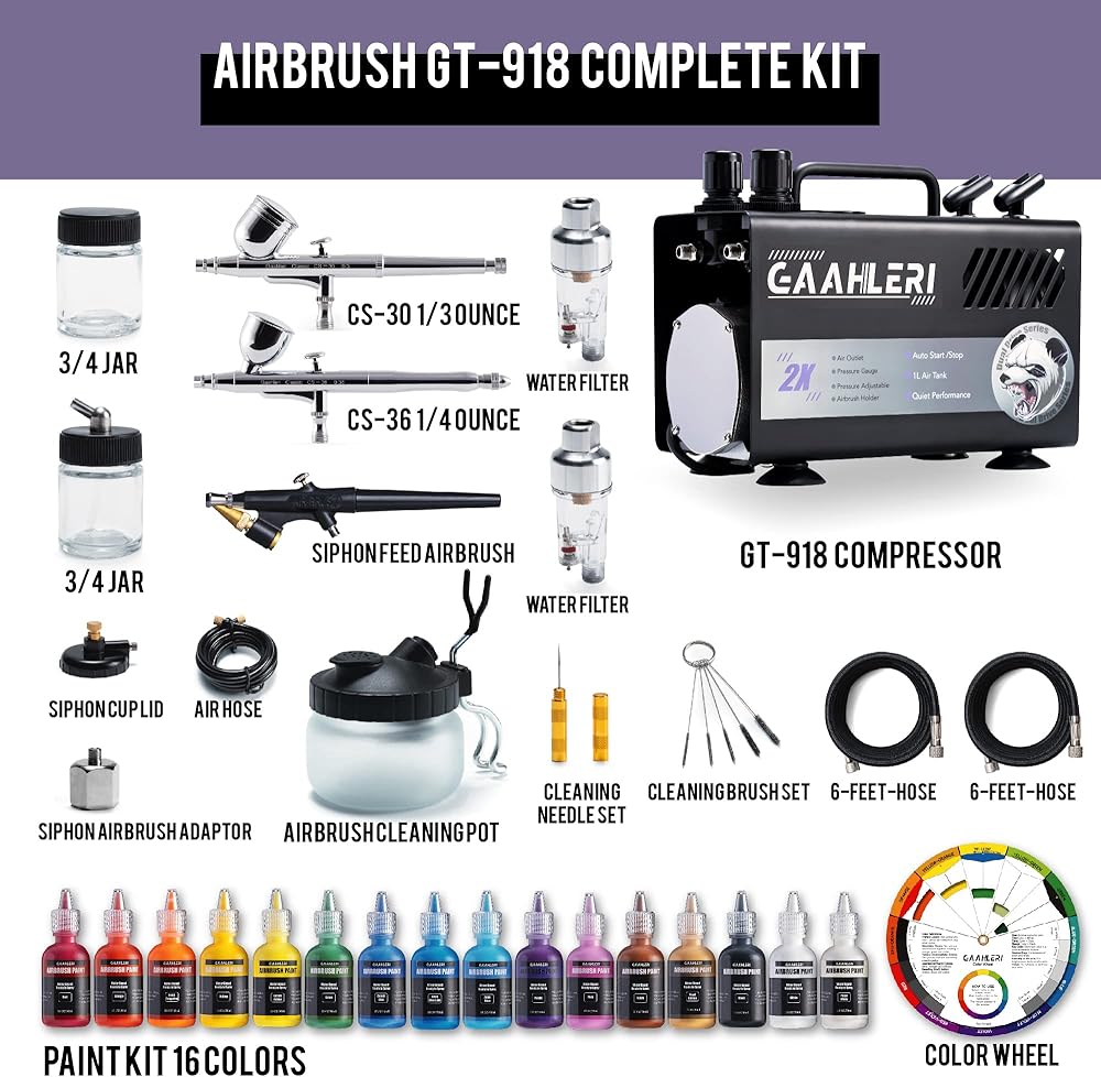 [ Complete Airbrush Kit & 24/7 Customer Service ] Gaahleri Airbrush Painting Kit comes with the Airbrush Covered Compressor GT-918 with attached Airtank * 1, 2 * 6-feet-hoses, 2 * Water Filters, 1 * Airbrush Cleaning Kit, 1 * CS-30 Airbrush gun, 1*CS-36 Airbrush gun, 1*Siphon feed airbrush, 1 * Color Wheel, 1*16 Colors Paint Kit and 1*Manual. Gaahleri offers a 1-year guarantee and 24/7 customer service.