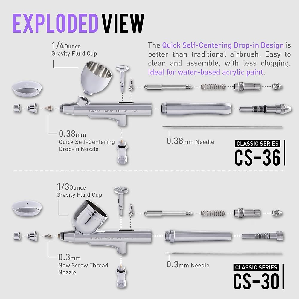 [ 3 types of advanced airbrushes ] The CS-36 Airbrush gun with a 1/4 oz gravity fluid cup and 0.38mm needle nozzle set has a quick self-centering structure. The CS-30 Airbrush gun with a 1/3 oz gravity fluid cup and 0.3mm needle nozzle set. Both airbrushes boasted virtually unbreakable nozzles when disassembling and improved atomization even when using thicker paints, clogging is less likely to occur. An extra 0.8mm tip 2*3/4 oz Jars Siphon Feed Airbrush provided.
