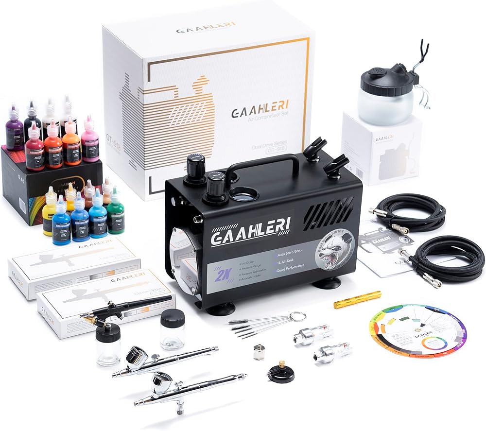 Gaahleri Professional Airbrush Painting Kit comes with two dual-action airbrush sprayguns and a durable compressor with 2 Air Outlet Pistons, which is the simplest way to do the painting work. The compact design makes painting or makeup easier to any beginner or advanced Painters for airbrushing painting job, such as : Airbrush Painting, Cake Decorating, Barber, Model Coloring, Nail Art Painting, temporary Body Painting, Shoes or T-shirt Coloring Painting etc.