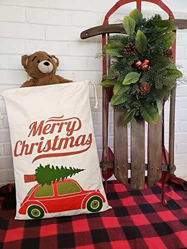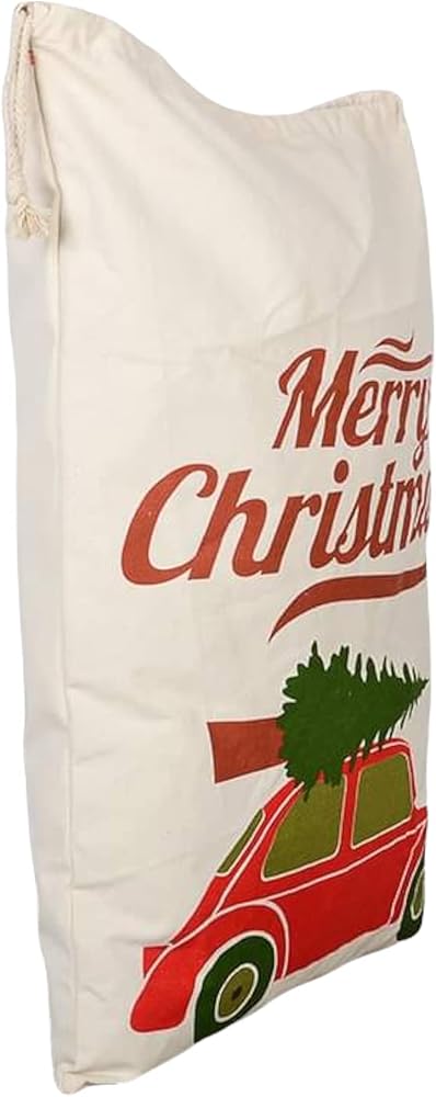 تصميم شاحنة حمراء - سيتم تزيين حقيبة عيد الميلاد الخاصة بك على جانب واحد بتصميم الشاحنة الحمراء المشهور على الإطلاق. تقوم هذه الشاحنة الصغيرة القديمة بسحب شجرة عيد الميلاد الخضراء الكبيرة في الجزء الخلفي من سرير الشاحنة. الكلمات "عيد ميلاد سعيد" مكتوبة بخط ذهبي على الجانب الأمامي لهذه الحقيبة القماشية
