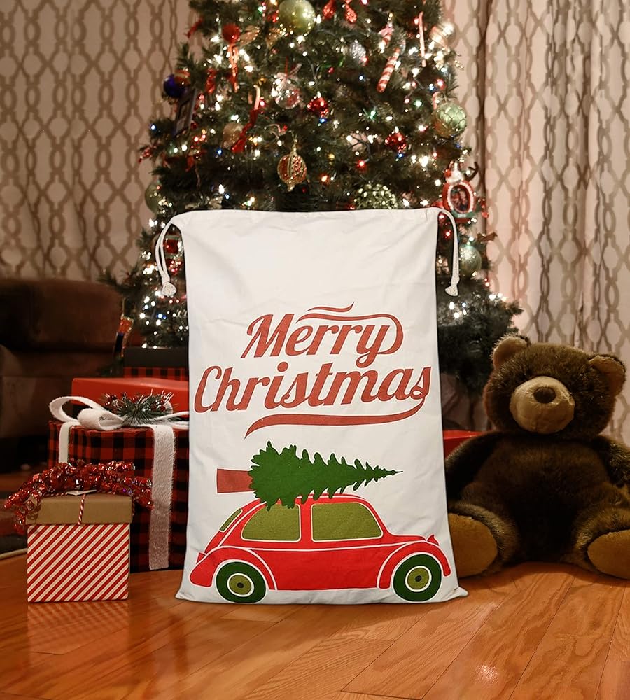 هيكل سميك عالي الجودة - يبلغ مقاس أكياس عيد الميلاد هذه للهدايا 68.58 سم طولاً × 48.26 سم عرضًا، وهي مصنوعة من نسيج قطني متين وشديد التحمل بنسبة 100%. يمكن غسل أكياس سانتا الكبيرة جدًا القابلة لإعادة الاستخدام في الغسالة أو غسلها يدويًا وتجفيفها لإعادة استخدامها عامًا بعد عام