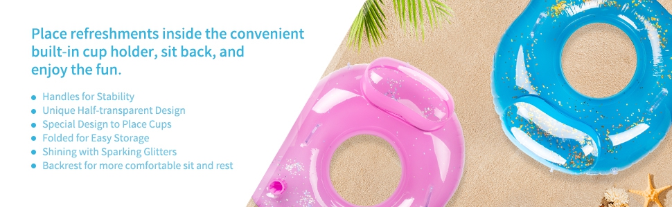 تصميم حاملات مدروس: تم تصميم حاملات الكؤوس بشكل منفصل على مسند الذراع على كلا الجانبين لراحتك، حتى تتمكن من الاستمتاع بمشروبك البارد أثناء الطفو على الماء. مقابض على كلا الجانبين لتحافظ على توازنك جيدًا.