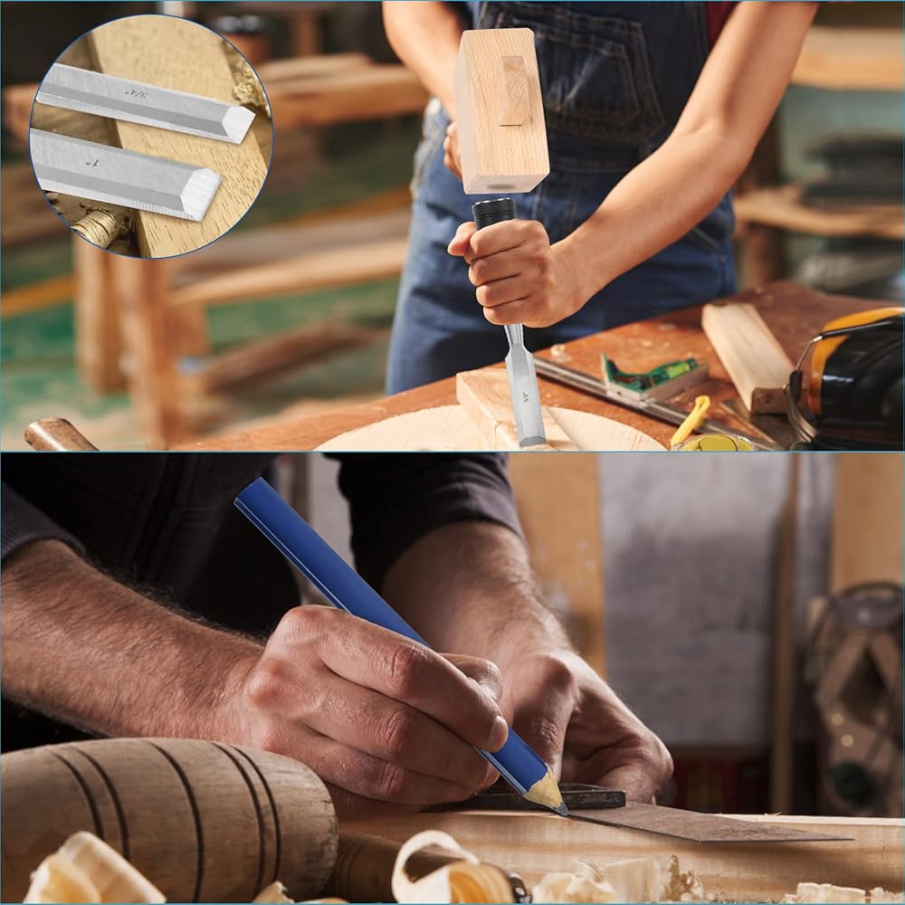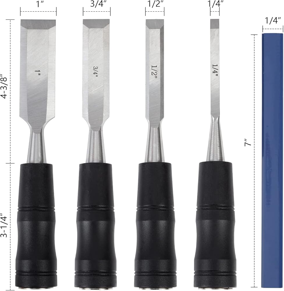 .غطاء طرفي معدني شديد التحمل من الأزاميل للضرب المتكرر... يأتي كل إزميل مع واقي شفرة تشيزل لحماية الحافة وسلامة عمال الخشب...أقلام تحديد مستطيلة النجار توفر أدوات العلامات في الأعمال الخشبية...جراب بسحاب من القماش يحافظ على مجموعات تشيزل منظمة ومأمونة..تتضمن مجموعة الأزاميل 4 × أزميل خشبية 1/4 بوصة (6 مم) ،1/2 بوصة (13 مم. ) 3/4 بوصة (19 مم) و1 بوصة (25 مم) 2 × قلم نجار، 1 × حقيبة تخزين بسحاب كأدوات ومعدات عمل خشبية جيدة