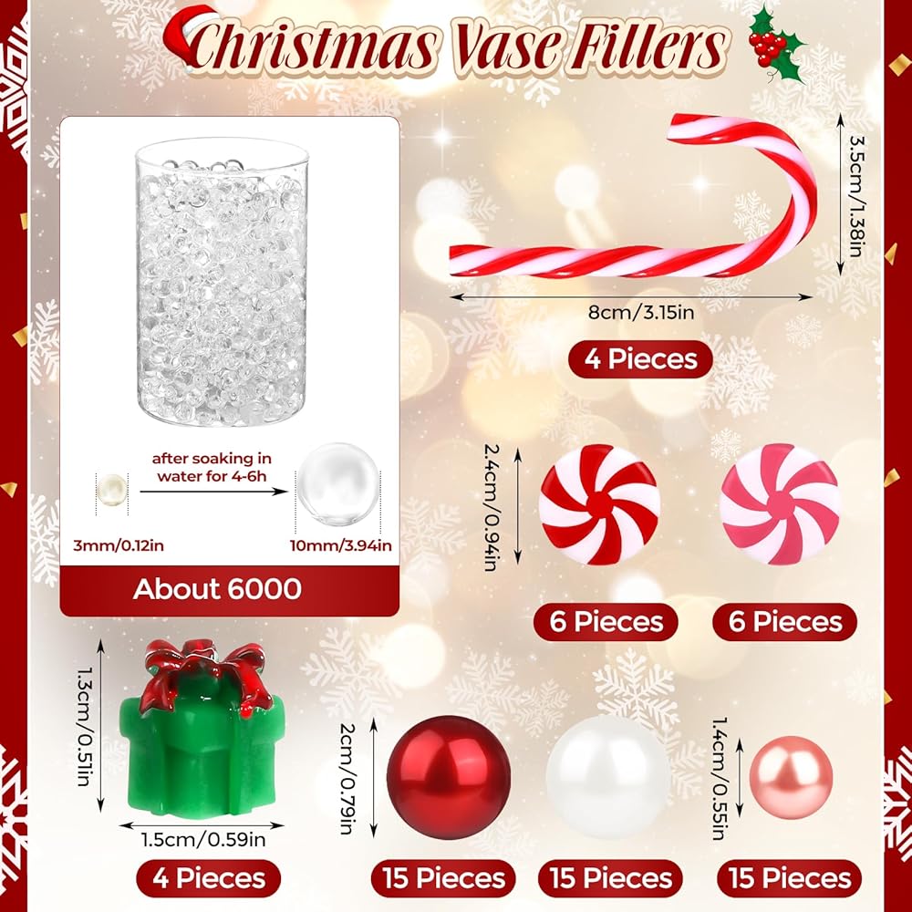 [تشمل العبوة] سوف تحصل على 6065 قطعة من زينة مزهرية عيد الميلاد: 6000 خرزة مائية، 12 حلوى، 4 قصب حلوى، 4 زينة لصناديق هدايا عيد الميلاد، 15 لؤلؤة حمراء، 15 لؤلؤة بيضاء، و15 لؤلؤة وردية.
