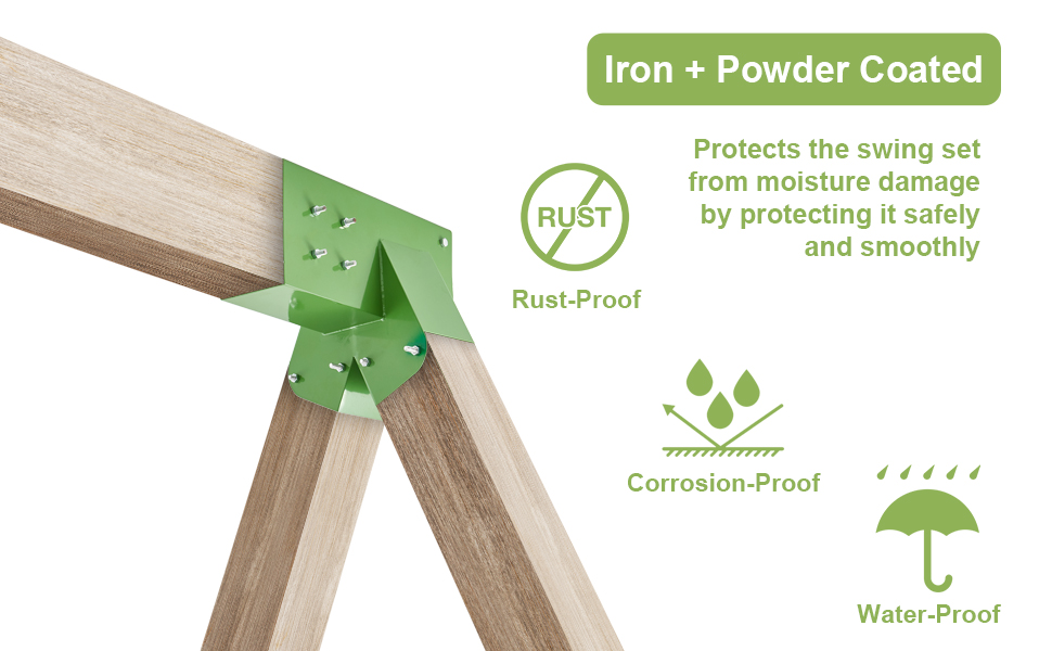 【A-Frame Construction 】The swing set bracket is constructed with heavy-duty iron and finished in a power-coated green color. It is effectively corrosion-proof, rust-proof, and water-proof to be durability in strenuous weather conditions.