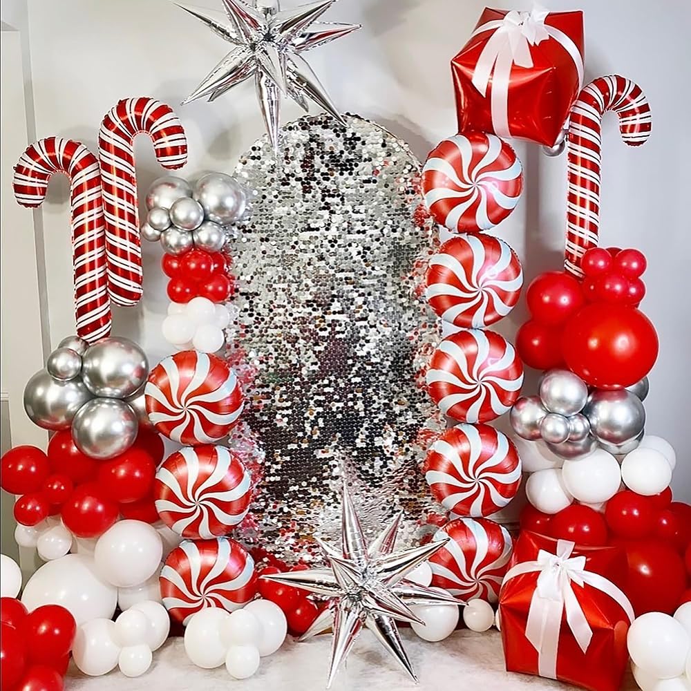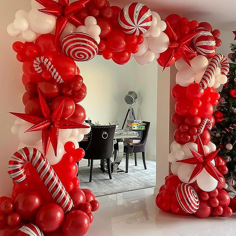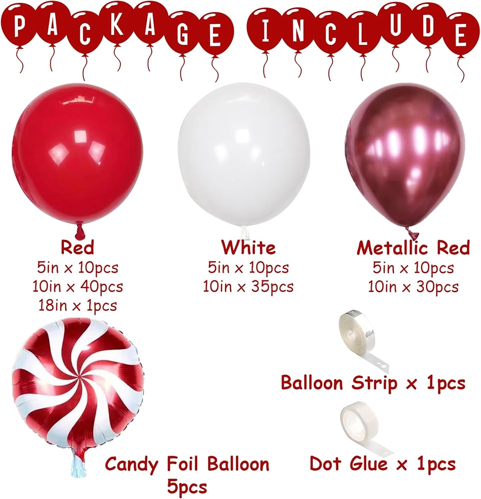 طقم قوس بالون أحمر وأبيض مكون من 141 قطعة، مع بالونات من رقائق الحلوى الحمراء المعدنية بأحجام مختلفة لتزيين حفلات عيد الميلاد وحفلات أعياد الميلاد وحفلات الزفاف