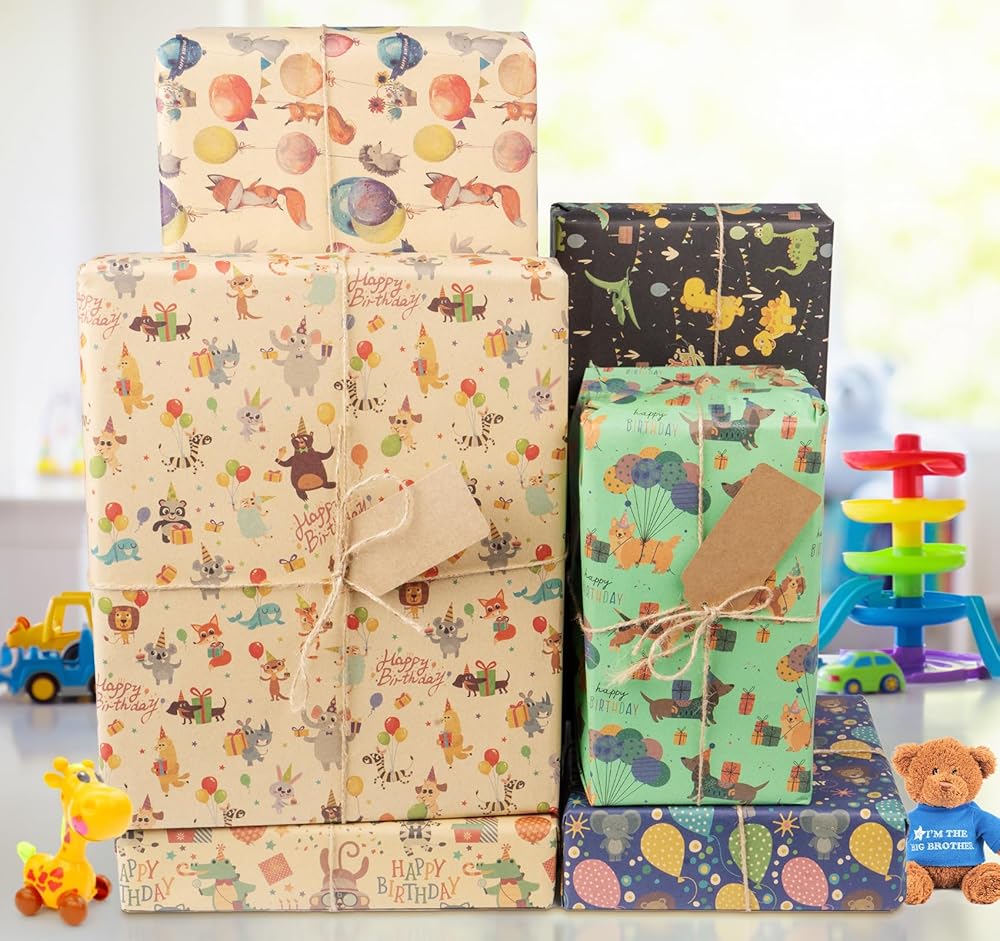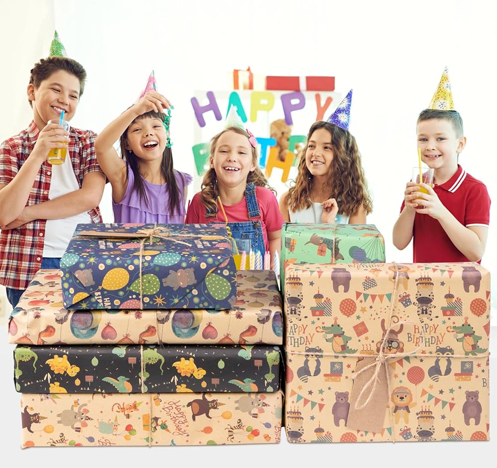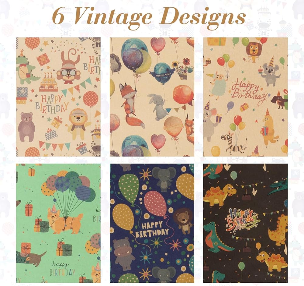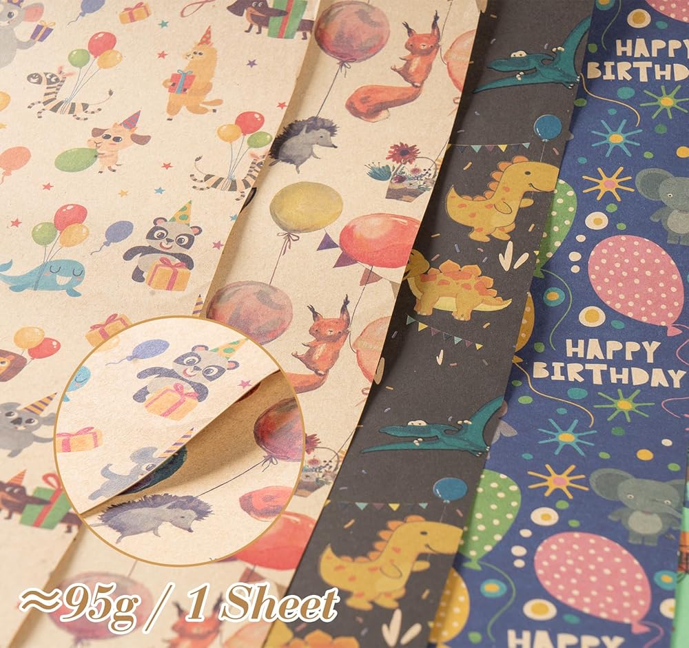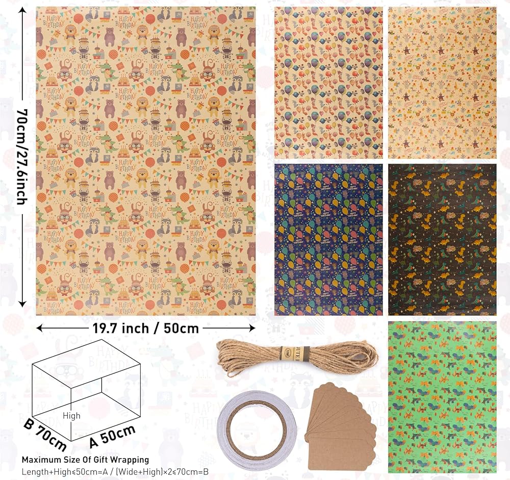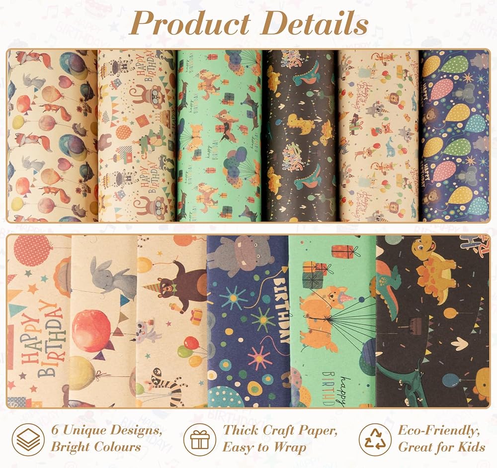 • Premium Quality: Our Birthday wrapping paper contains "Happy Birthday" text,Elevate your gift-giving experience with our set of 6 sheets of high-quality kraft paper featuring 6 cute designs. Each sheet is crafted from durable and stylish kraft paper, adding an extra touch of elegance to your presents.