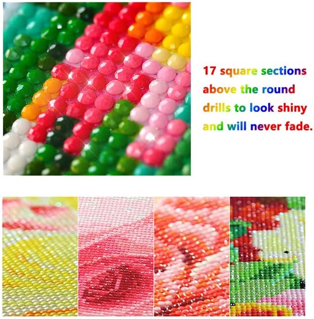 الجيل الجديد من الماس - 17 قسمًا مربعًا فوق المثقاب الدائري لتبدو لامعة ولن تتلاشى أبدًا وهي أكثر لمعانًا من الماس الراتنج العام، مما يجعل اللوحة مشرقة ولها بعد ثالث قوي.