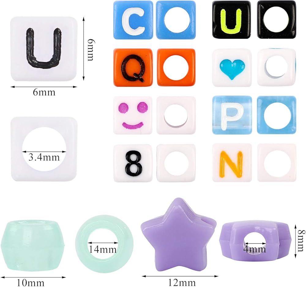 الحجم: حجم حبة الأبجدية حوالي 6 مم، حجم الفتحة حوالي 3.4 مم؛ وهج شفاف في حجم الخرزة الداكن حوالي 6 × 8 مم، حجم الفتحة حوالي 4 مم؛ حجم حبة النجوم الخماسية الملونة حوالي 8 × 12 مم، وحجم الفتحة حوالي 4 مم.