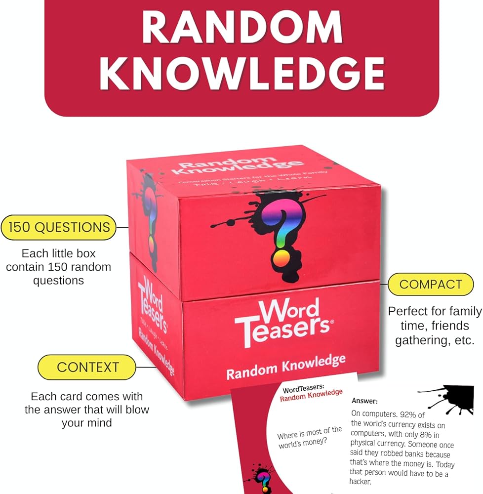 تختبر لعبة التوافه الممتعة هذه كل المعرفة العشوائية التي قمت بتخزينها في عقلك. من كمية الملح في المحيط إلى الطعام الذي سيدوم مدى الحياة، لعبة البطاقات الممتعة هذه للعائلات رائعة لليالي الألعاب أو بداية المحادثات. اقلب البطاقات ذات الوجهين واكتشف حقائق وتفاصيل ممتعة حول موضوع السؤال! اختبر معرفتك العشوائية وتعلم المزيد عن العالم من حولك!
