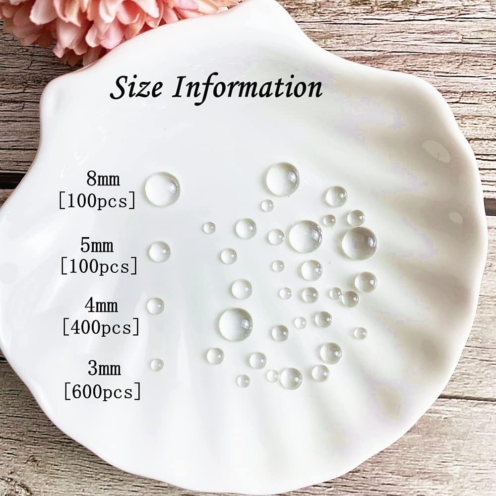 【Measurements】Our transparent dewdrop embellishments have 4 sizes,including 8 mm/ 0.32 inch (100 pieces), 5 mm/ 0.20 inch (100 pieces), 4 mm/ 0.16 inch (400 pieces) and 3 mm/ 0.12 inch (600 pieces),each size is packaged separately for easy access.