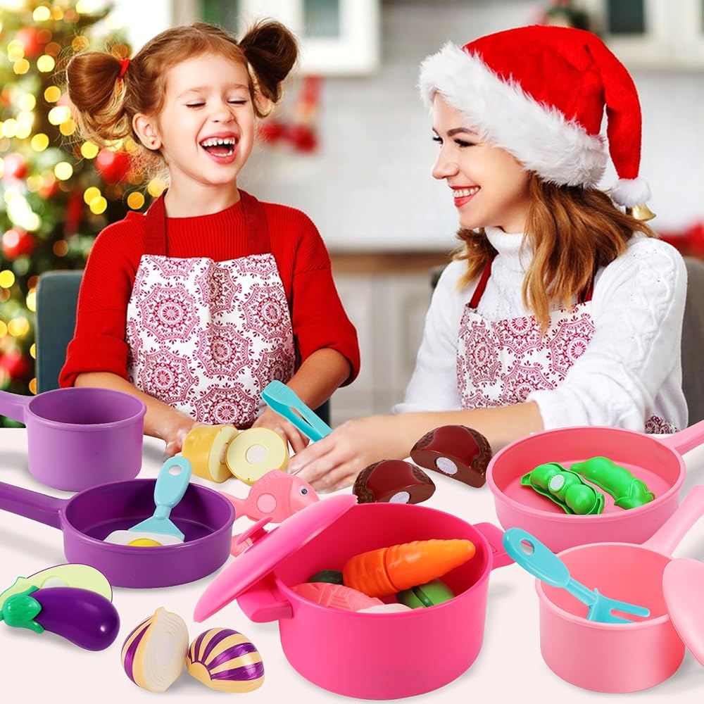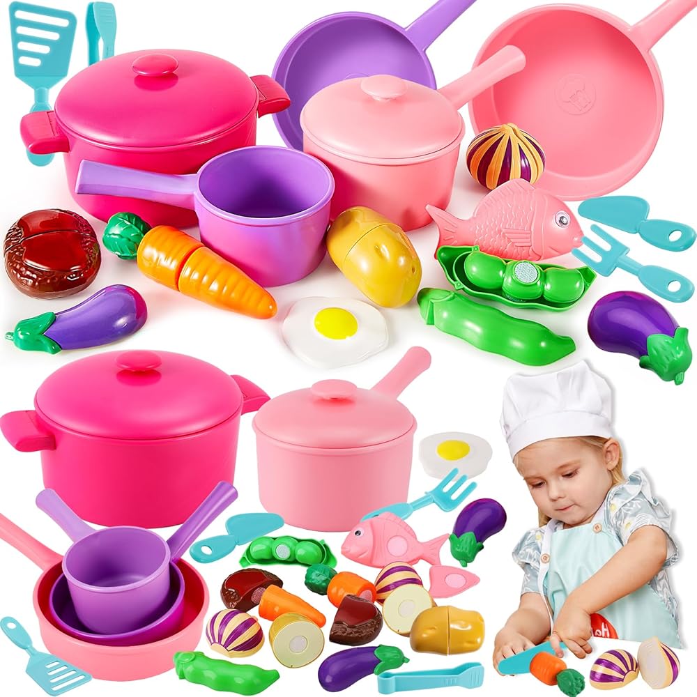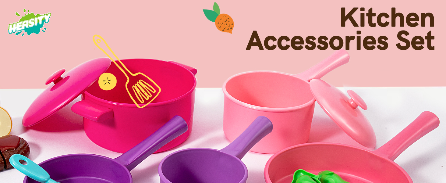 أطفال هيرسيتي يلعبون طعام المطبخ وملحقاته، أواني الطبخ التظاهرية للأطفال الصغار، مجموعة ألعاب القطع، مجموعة أدوات الطبخ، هدايا لعمر 3 4 5 سنوات للأولاد والبنات والأطفال