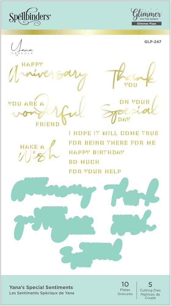 تعد مجموعة ألواح وقوالب الرقائق المعدنية اللامعة الخاصة من يانا جزءًا من مجموعة يانا بلومينج بيرثداي من يانا. تحتوي المجموعة المكونة من 10 أطباق على خمسة مشاعر أكبر مع قوالب مطابقة للقطع. تتضمن: اصنع أمنية، شكرًا لك، في يومك الخاص، أنت صديق رائع، والذكرى السنوية السعيدة. الأطباق الخمسة الأخرى لها مشاعر أصغر: Happy Birthday، For Being There For Me, For Your helpp, I Hope It will come true, and so much.