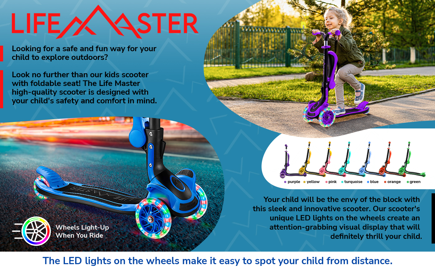 مصابيح LED مدمجة - يتميز تصميم لعبة السكوتر لدينا بمصابيح عجلة LED متعددة الألوان تضيء عند التدحرج. إنها طريقة رائعة لتشجيع طفلك على ممارسة مهاراته في الإسراع وتطوير توازنه وتنسيقه بالإضافة إلى توفير ميزة الأمان أيضًا. مناسب للاستخدام الداخلي والخارجي، سكوتر الأطفال ثلاثي العجلات خفيف الوزن وصغير الحجم وقابل للحمل مما يجعله مثاليًا للذهاب إلى الحديقة وفي العطلات واللعب في الحديقة أيضًا.