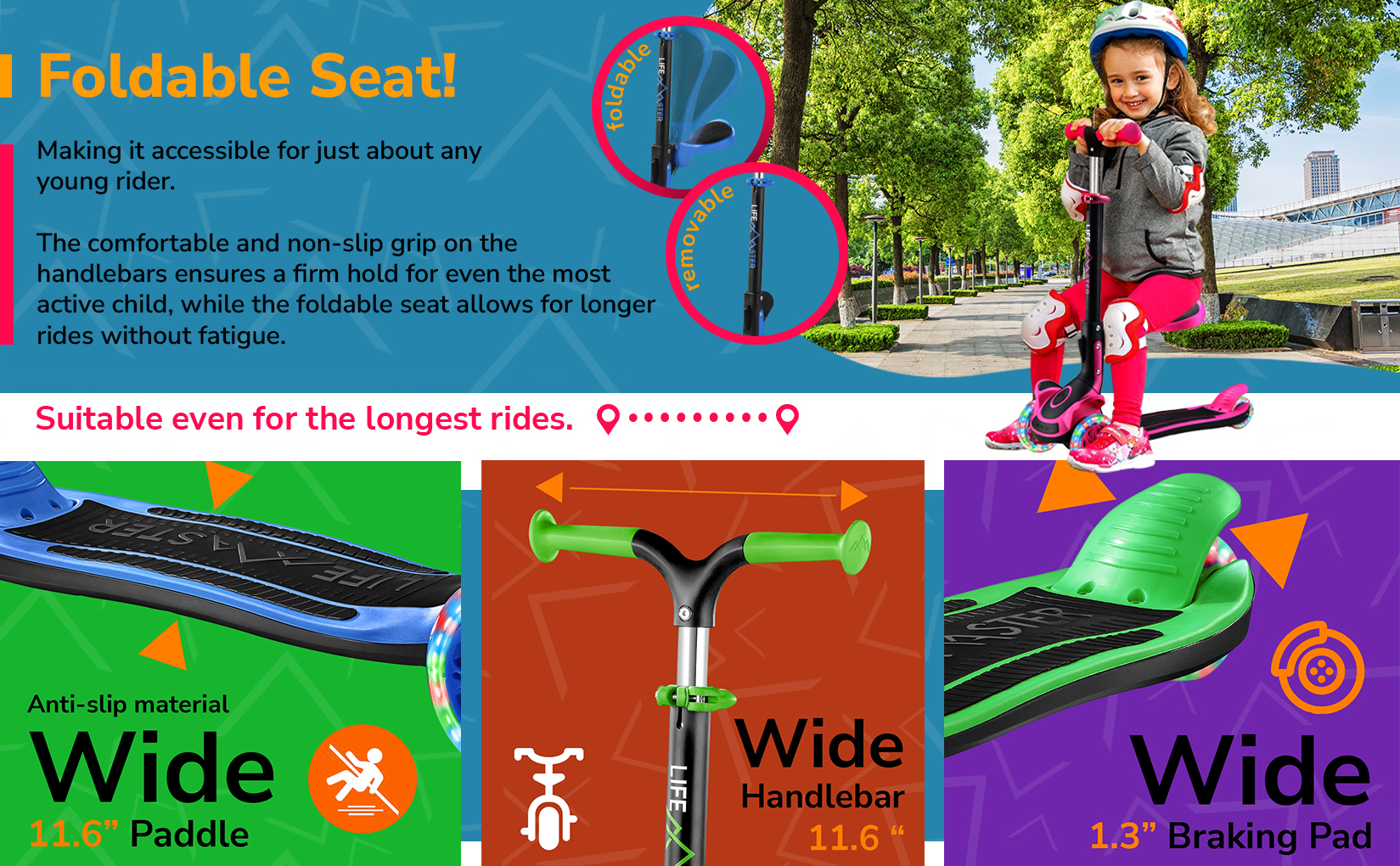 تصميم سكوتر للجلوس أو الوقوف - تعني تقنية الميل إلى التوجيه أن طفلك يمكن أن يميل إلى الدوران مما يساعد على تحسين توازنه وتنسيقه، وتحقيق التوازن الذاتي تمامًا سواء اختار الوقوف أو الاستفادة من مقعد الطفل المريح القابل للطي. هناك أيضًا مسند قدم فريد يمكنهم استخدامه عند التجول. يمكن إزالة المقعد بسهولة إذا كان طفلك يفضل استخدام سكوتر الوقوف