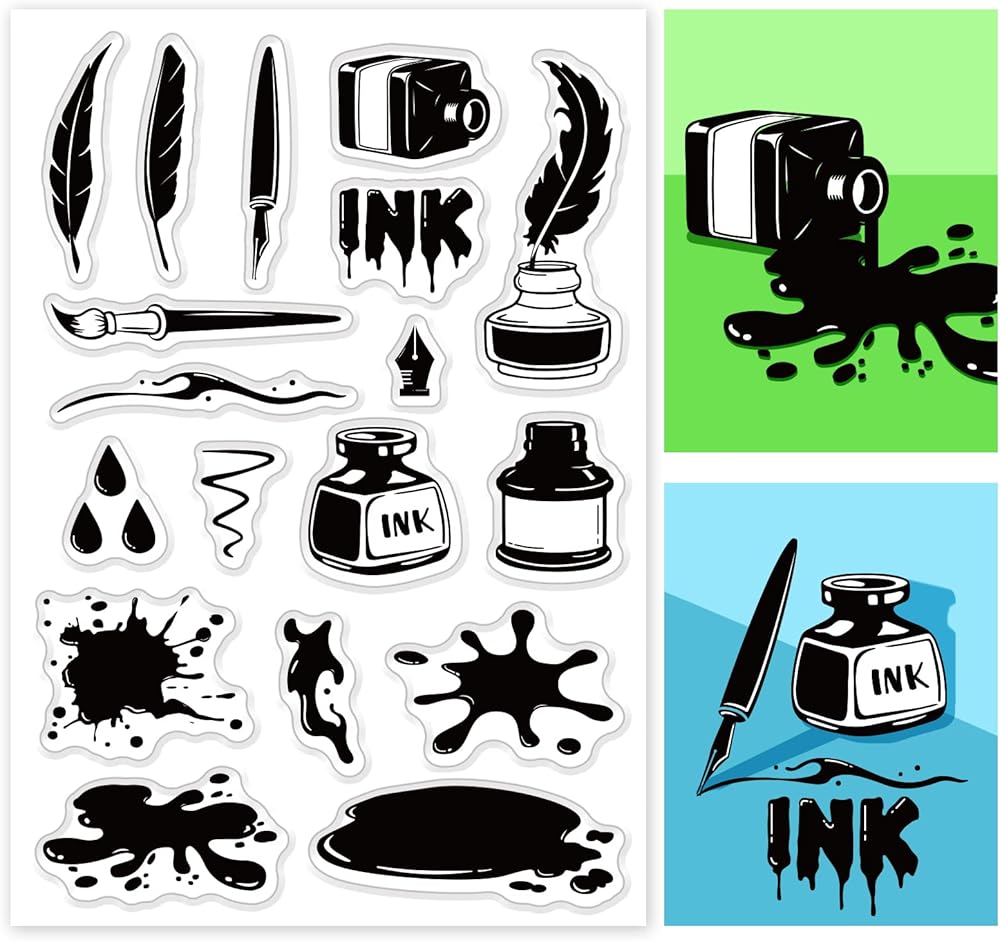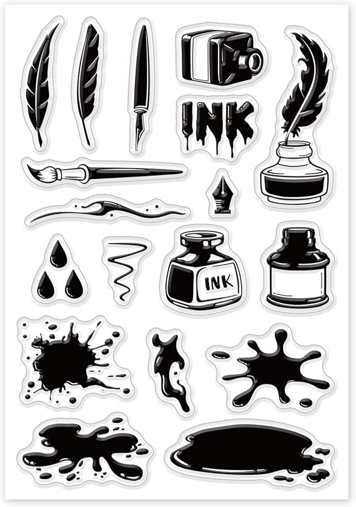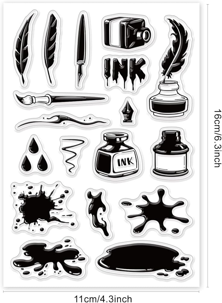 Ink and Pen Theme: 1 sheet 16x11cm/6.3x4.3inch clear silicone stamp with patterns of ink bottle, pen, quill pen, ink stains, ink droplets. Great for decorating your envelope, postcard, scrapbook, diary and holiday cards.