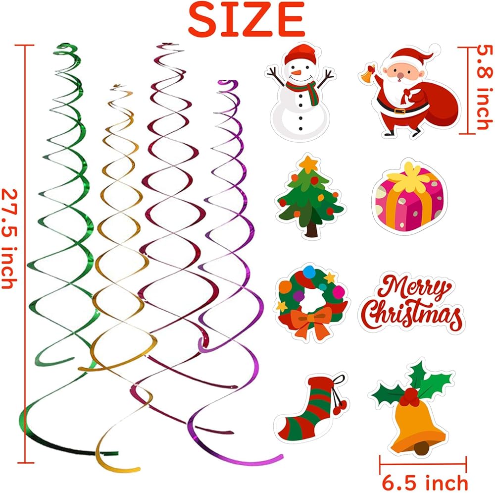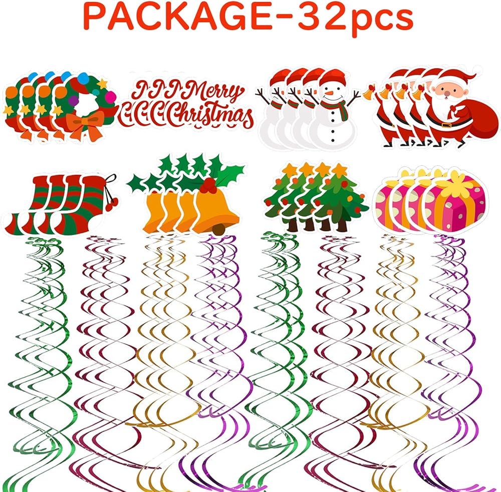 32 مجموعة من ديكورات عيد الميلاد - تتضمن مجموعة ديكورات دوامات عيد الميلاد 32 قطعة من الشرائط اللامعة (4 ألوان × 8 قطع لكل لون)، و32 قطعة من ورق البطاقات (8 أنماط عيد الميلاد الأصلية × 4 قطع لكل نمط). كميات كافية لحفلة عيد الميلاد الخاصة بك.