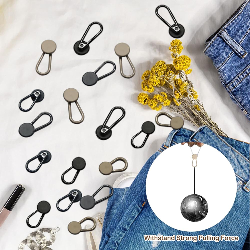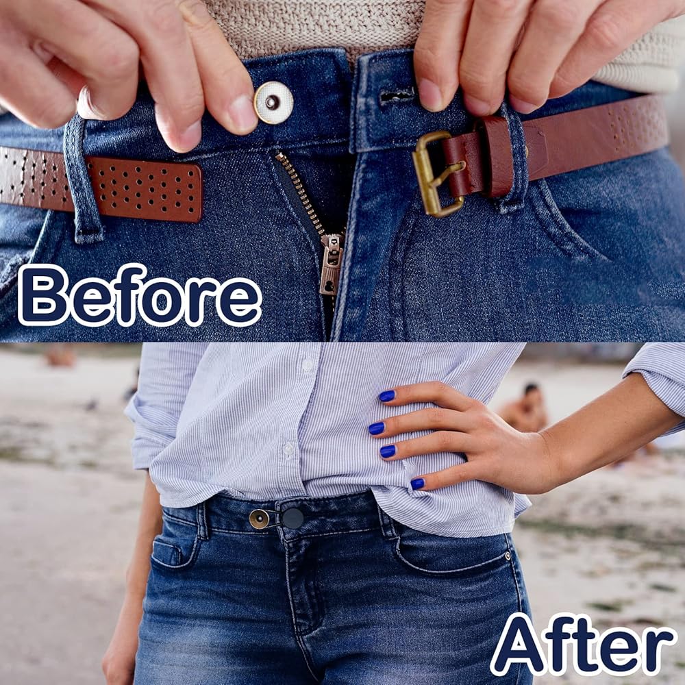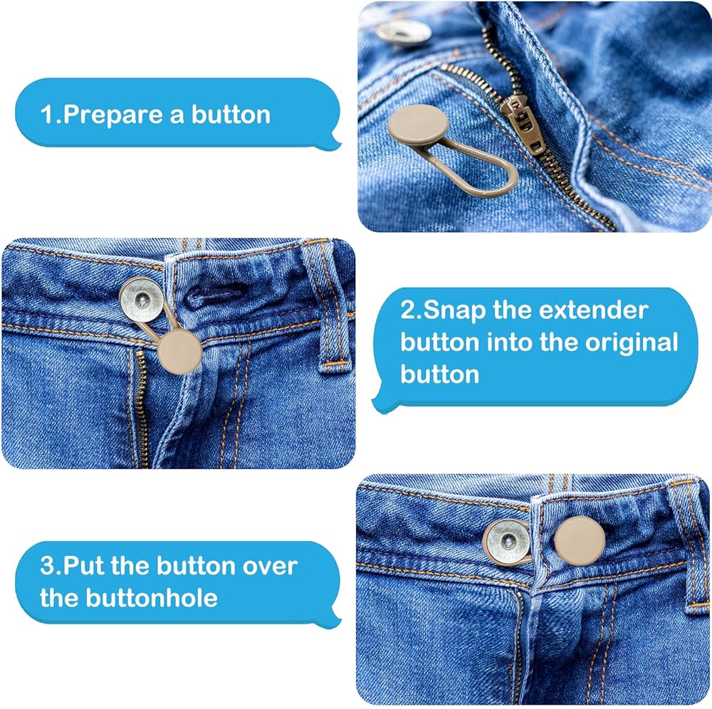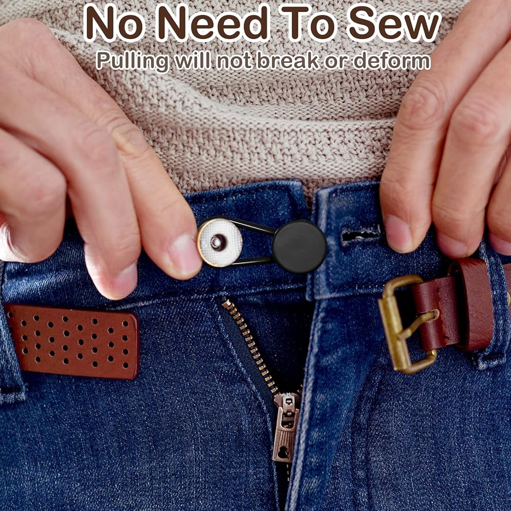 سيحل موسع الأزرار الخاص بنا مشكلة أزرار السراويل الضيقة جدًا أو عدم إغلاقها. ما عليك سوى تمرير موسع الأزرار الخاص بنا فوق الزر الموجود على الجينز الخاص بك وقم بتوصيل الطرف الآخر بفتحة الزر.