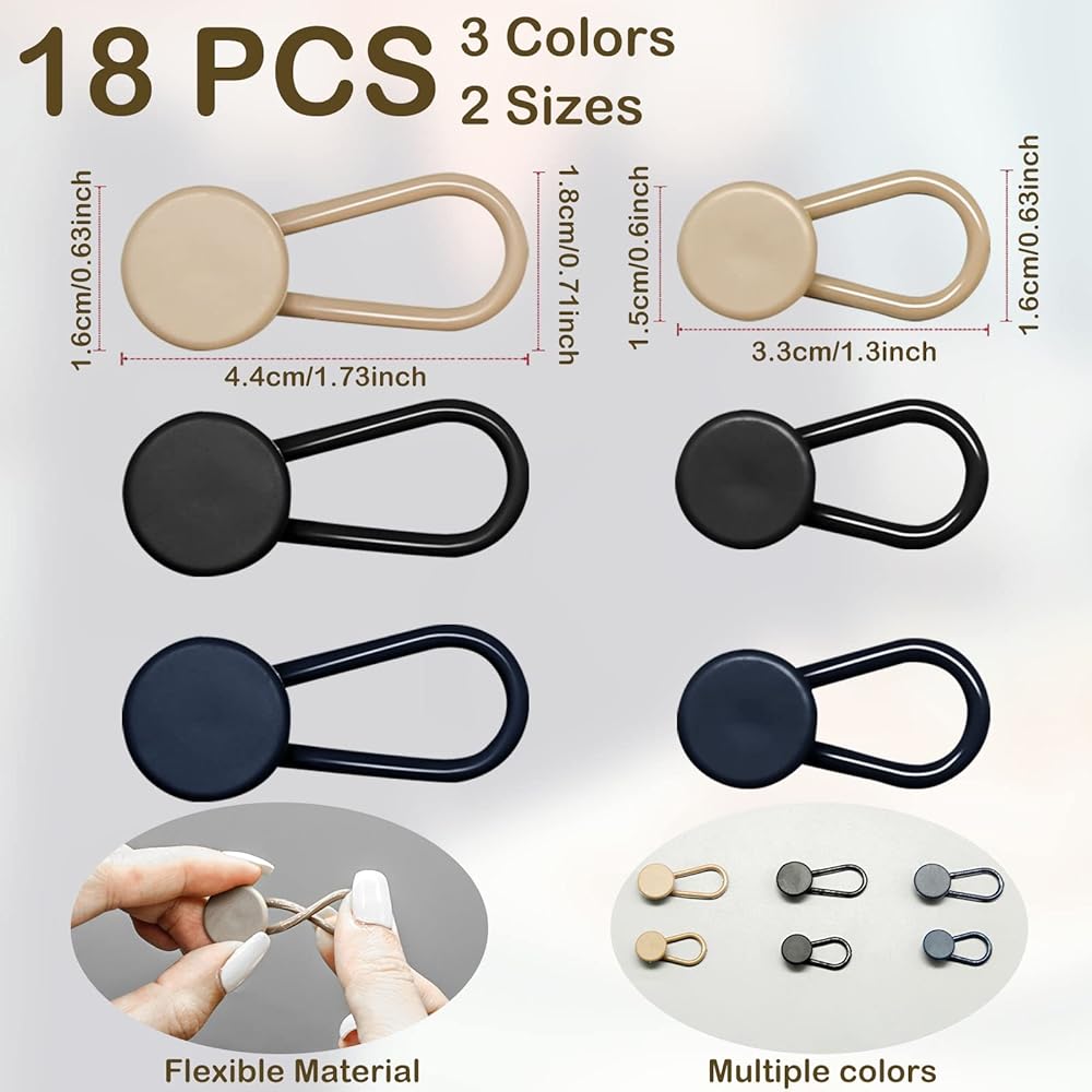 【ما تحصل عليه】 سوف تحصل على 18 قطعة من موسع الخصر في 3 ألوان مختلفة، الكاكي، الأسود والأزرق، وطولين مختلفين، بقطر 0.7 انش و0.6 انش. يمكن مطابقة الألوان والمقاسات المختلفة مع أزواج متعددة من الجينز أو سراويل البدلة أو القمصان. إذا كان لديك أي أسئلة حول منتجاتنا، يمكنك الاتصال بنا في أي وقت وسوف نقوم بالرد عليك في أقرب وقت ممكن.