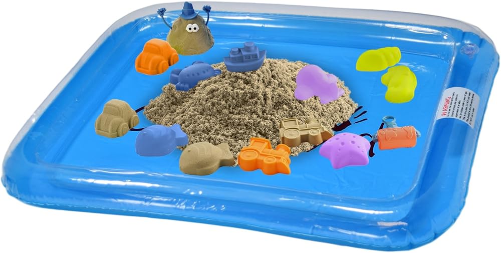 صينية صندوق الرمل القابلة للنفخ من كول ساند مثالية للاستخدام مع جميع منتجات الرمل الحركي للعب من كول ساند. يمكن نفخها وتفريغها بسهولة لسهولة التخزين. الرمل الحركي من كول ساند غير متضمن.