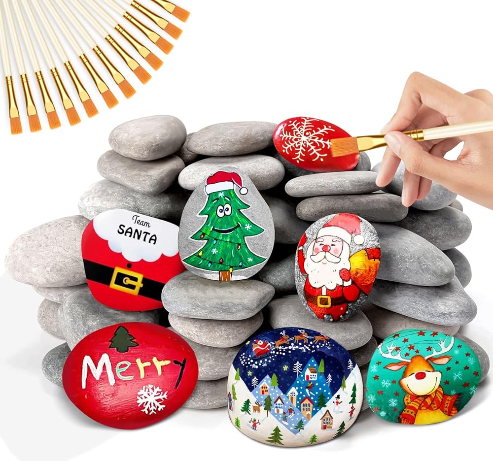 28 قطعة من صخور النهر للطلاء، 6 باوند 2-3 انش صخور كبيرة طبيعية للطلاء، صخور رسم حرفية مسطحة و12 فرشاة طلاء، احجار لطيفة لهدايا الكريسماس والحرف اليدوية والديكور