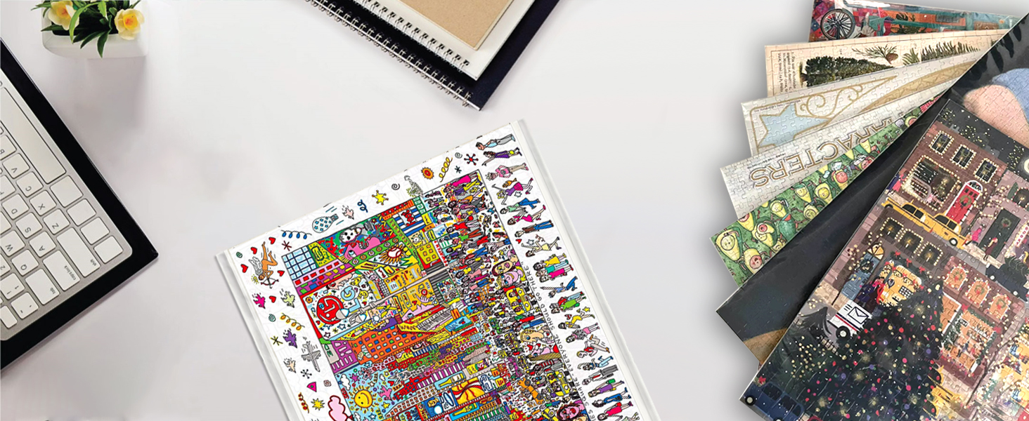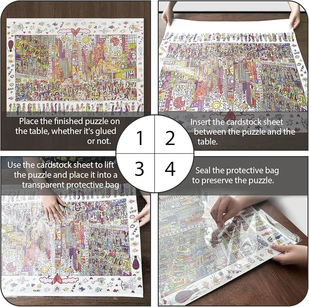 سهلة الاستخدام، ضع الأحجية المكتملة على سطح مستوٍ، وأدخل البطاقات تحتها. استخدم البطاقات كدعم لرفع الأحجية وإدخالها في حقيبة التخزين الشفافة.
