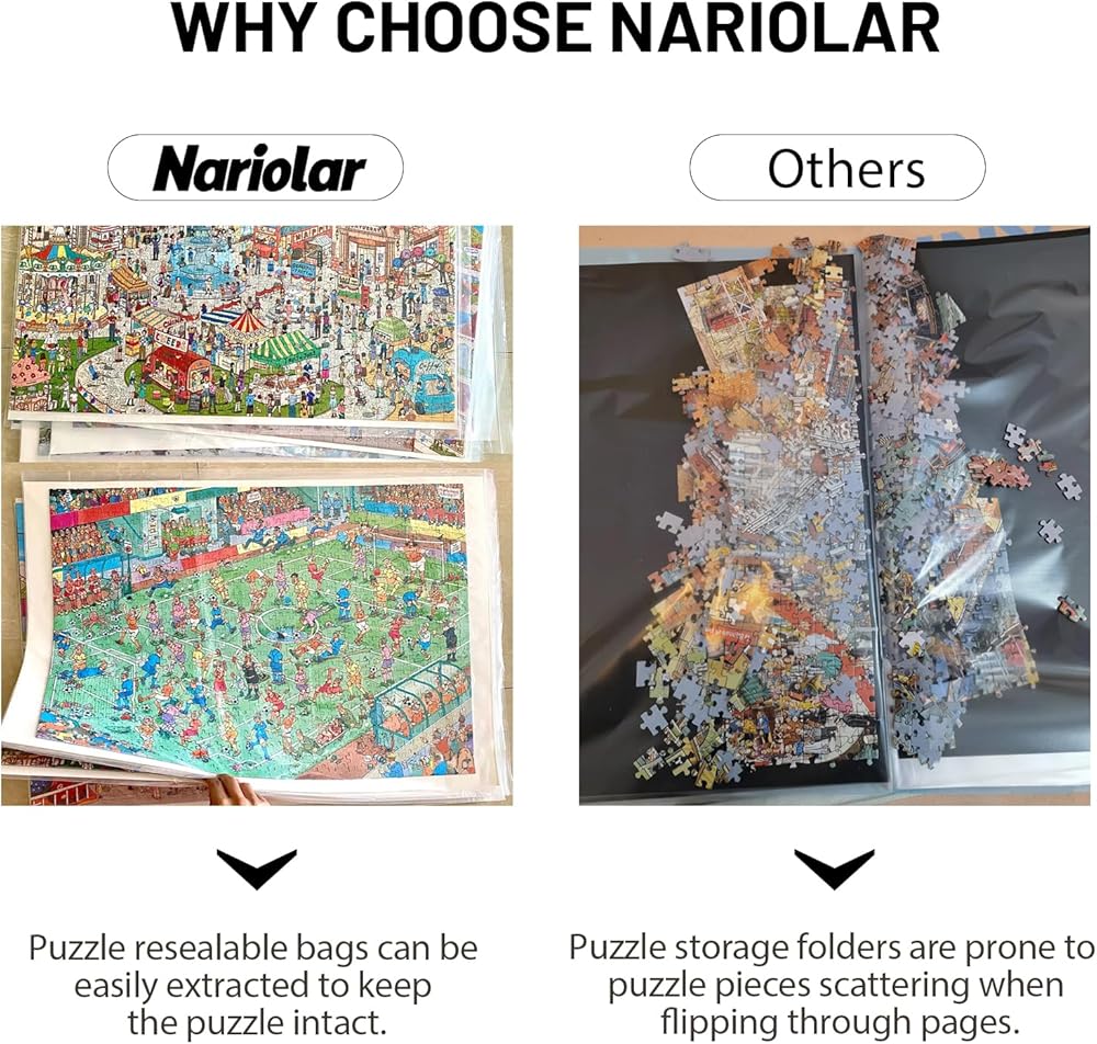 سهولة معززة لمنع الألغاز من التناثر أثناء قلبها عبر مجلدات التخزين، توفر ناريولار 10 أكياس شفافة منفصلة. يسمح هذا النهج بسهولة استخراج الأحجية، مما يزيل متاعب سقوط القطع بسبب قلب الصفحات.